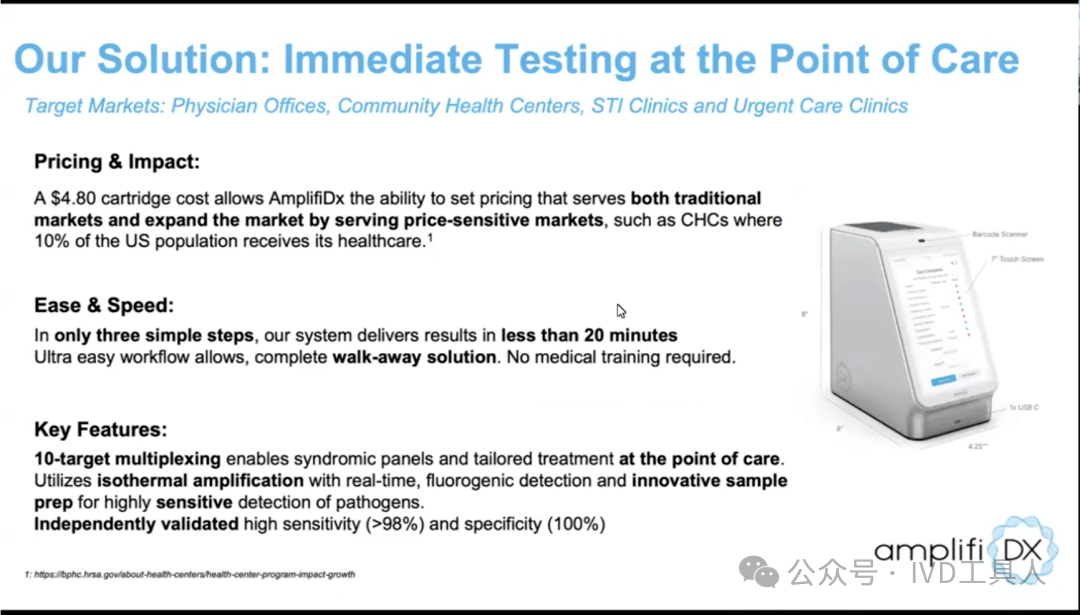 护理点分子诊断开发商AmplifiDx上周表示,美国国家卫生研究院(RADx)已将该机构为该公司开发诊断测试系统的资金增加了95.4万美元,总额超过450万美元。 该资金是通过美国国立卫生研究院国家生物医学成像和生物工程研究所快速加速诊断(RADx)技术计划授予的,将支持该公司AmplifiDx DX 100平台的最后阶段开发,该平台将用于执行RespiFast核酸扩增测试(NAAT),以检测和分化SARS-CoV-2、流感A/B和RSV病毒。 AmplifiDx首席执行官Nancy Schoenbrunner在一份声明中表示,这笔额外资金将使我们能够加快创新诊断系统的开发,帮助我们向市场带来快速、准确和负担得起的测试解决方案,以满足医疗保健提供者和患者的迫切需求。 该公司于2023年5月宣布,通过RADx计划获得了140万美元,以支持NAAT平台和基于拭子的呼吸面板的开发。该公司还获得了美国国立卫生研究院70万美元的资金,以支持开发沙眼衣原体、淋病奈瑟菌和高风险人类乳头瘤病毒的测试。 该公司在其网站上表示,其平台用于每次测试最多10个分析物的同时分析,并在20分钟内提供结果。