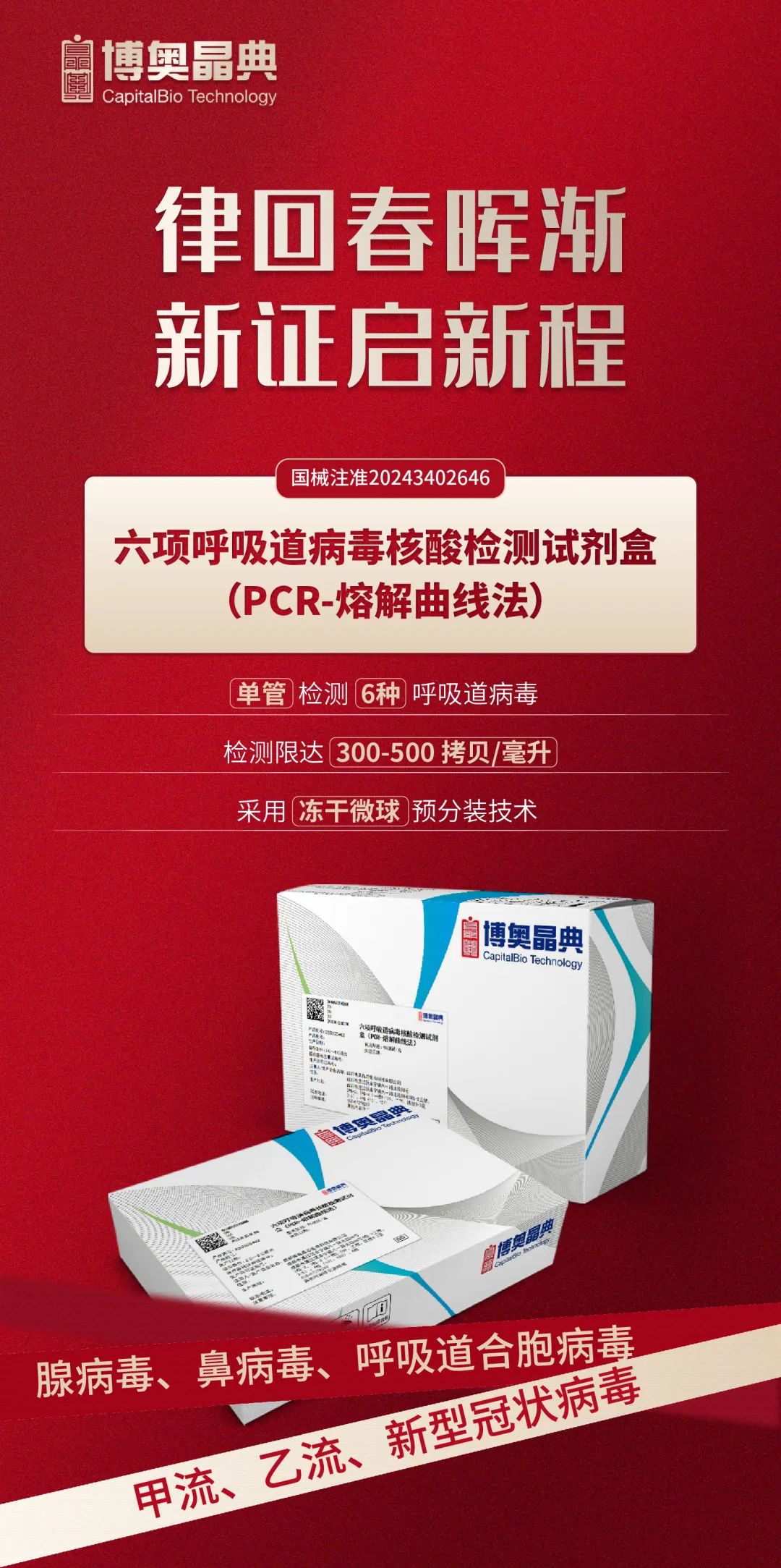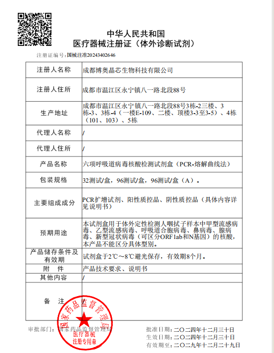 2024年12月31日博奥晶典六项呼吸道病毒核酸检测试剂盒(PCR-熔解曲线法)正式获得国家药品监督管理局(NMPA)第三类医疗器械注册证(注册证号:国械注准20243402646)。该试剂盒可用于常见呼吸道病毒类别检测,精准甄别包含甲型流感病毒、乙型流感病毒、呼吸道合胞病毒、鼻病毒、腺病毒、新型冠状病毒共6种常见呼吸道病毒,辅助临床对呼吸道病毒进行诊断治疗。