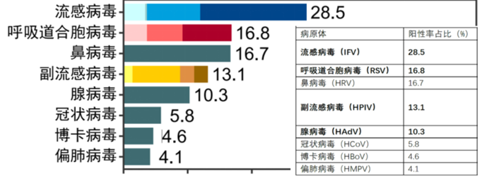 根据2023年冬季国家卫健委发布的《多重病原体流行期间呼吸道感染临床诊治专家共识》结果,门急诊流感样病例中常见的病原体为甲流、乙流、新冠病毒、呼吸道合胞病毒、腺病毒、人偏肺病毒、鼻病毒及副流感病毒。在急性呼吸道感染的患者中,有34.8%的患者至少感染一种病毒且呈阳性,其中儿童的感染率最高。在住院部,流感病毒和腺病毒是引起严重急性呼吸道感染主要病原体。