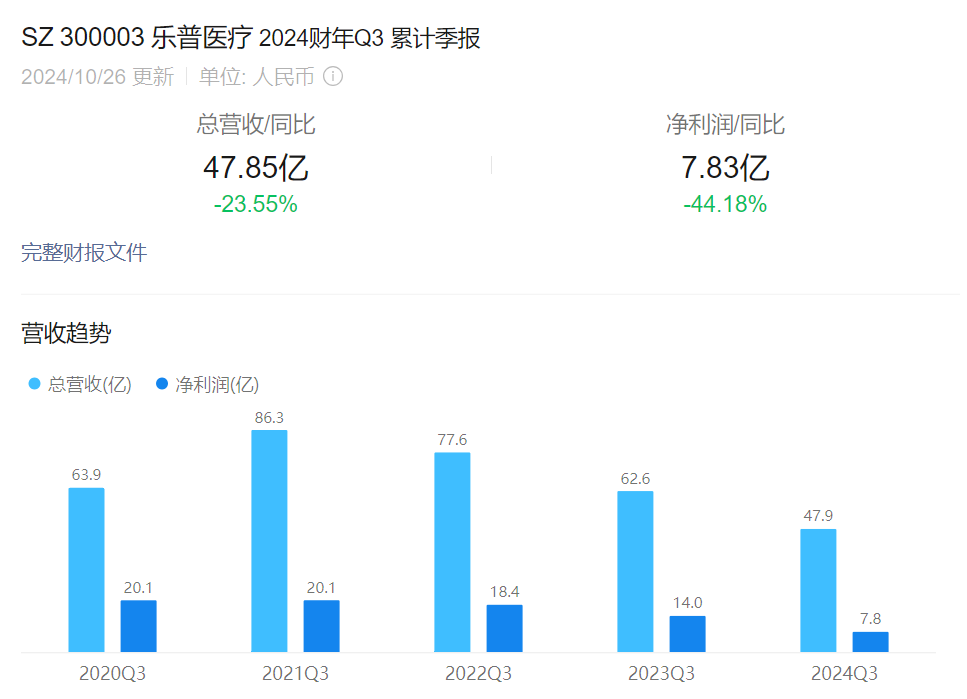 一、乐普医疗的昔日辉煌曾几何时,乐普医疗在医疗领域可谓声名远扬,是投资者眼中的明星企业。 乐普医疗作为中国最早研发心血管植介入器械的公司之一,拥有多项 “国产第一” 的荣耀,无载体冠脉药物支架、双腔心脏起搏器、冠脉生物可吸收支架等开创性产品,均出自乐普医疗之手,构建起了涵盖医疗器械、药品、医疗服务及健康管理的庞大业务版图。 在业绩增长方面,乐普医疗也有过辉煌的历史。 从2015年~2021年长达7年的时间里,乐普医疗业绩年年增长,营收从不足28亿元上涨至106亿元,成长为“百亿医械巨头”。 2020年~2022年,乐普医疗虽然遭遇了疫情冲击,最严重时其相关产品销售几乎停滞。但即便如此,乐普医疗在2020年~2022年的营收依然保持增长,从80亿元上涨至106亿元。 更厉害的是乐普医疗在主营业务上的盈利能力,2015年~2022年,乐普医疗扣非净利润保持连续8年增长,从年盈利5亿元上涨至年盈利21亿元。 乐普靠着强劲的盈利能力和良好的发展态势,稳稳占据着心血管医疗市场的重要地位,成为行业内众多企业追赶的目标。 二、业绩爆雷之殇然而,辉煌似乎渐渐远去,近年来乐普医疗陷入了业绩爆雷的困境。 2022-2023 年,公司业绩下滑势头明显。 在疫情期间,乐普营收和净利润保持了稳中上涨,2023年疫情结束后,乐普医疗的门诊量、手术量快速恢复,这让公司一度产生乐观预期,认为受益于门诊量、手术量恢复,相关产品销售将实现正向增长。 然后现实很快就打脸了。 2023 年营收仅约 79.8 亿元,同比减少 26.3 亿元;净利润仅约 12.58 亿元,同比减少约 9.46 亿元,降幅达到 42.91%;扣非净利润更是降至 11.13 亿元,同比大降 47.6%。 到了 2024 年,情况依然不容乐观。前三季度公司实现营业收入 47.85 亿元,同比下降 23.55%;归母净利润 8.03 亿元,同比下降 40.70%;扣非净利润 7.34 亿元,同比下降 42.91%。 第三季度单季业绩下滑更为显著,实现营业收入 14.02 亿元,同比下降 28.41%,环比下降 4.12%;归母净利润 1.05 亿元,同比下降 73.12%,环比下降 51.05%;扣非净利润 8692.7 万元,同比下降 77.19%,环比下降 54.42%。