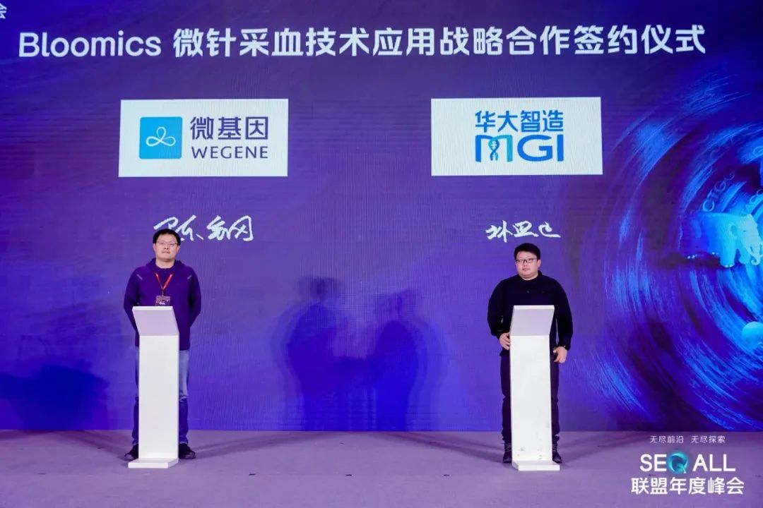 2025年1月4日,在华大智造SEQ ALL联盟年度峰会上,微基因( WeGene,深圳市早知道科技有限公司)与华大智造宣布达成战略合作,双方将基于华大智造的Bloomics®一次性使用末梢采血系统和微基因的DNA甲基化检测技术展开更深入的合作,共同推动国内消费级基因检测领域的健康发展,共启个人多组学健康管理领域的新篇章。 微基因创始人及CEO陈钢博士和华大智造新业务拓展中心总监林思远代表双方签约 “从2018年7月至今,基于华大智造的测序平台,微基因全基因组测序服务已交付近两万份DTC个人全基因组测序,数据质量表现稳定。我们期待与华大智造在Bloomics®采血系统的深度合作能够进一步推动DNA甲基化检测技术的发展,为个人多组学健康管理贡献力量。” “Bloomics®源自于汪老师十几年前一次户外观察蚂蟥吸血得到的灵感,方便、无痛的血液样本采集是科学研究和健康管理第一环,也是华大集团13311i战略里的入口。华大智造始终致力于打造生命科学核心工具,这次和微基因的合作将加速双方资源的整合,实现华大智造创新的采样技术与微基因的多组学检测技术的深度融合,共同打造一站式、精准化健康管理解决方案。”