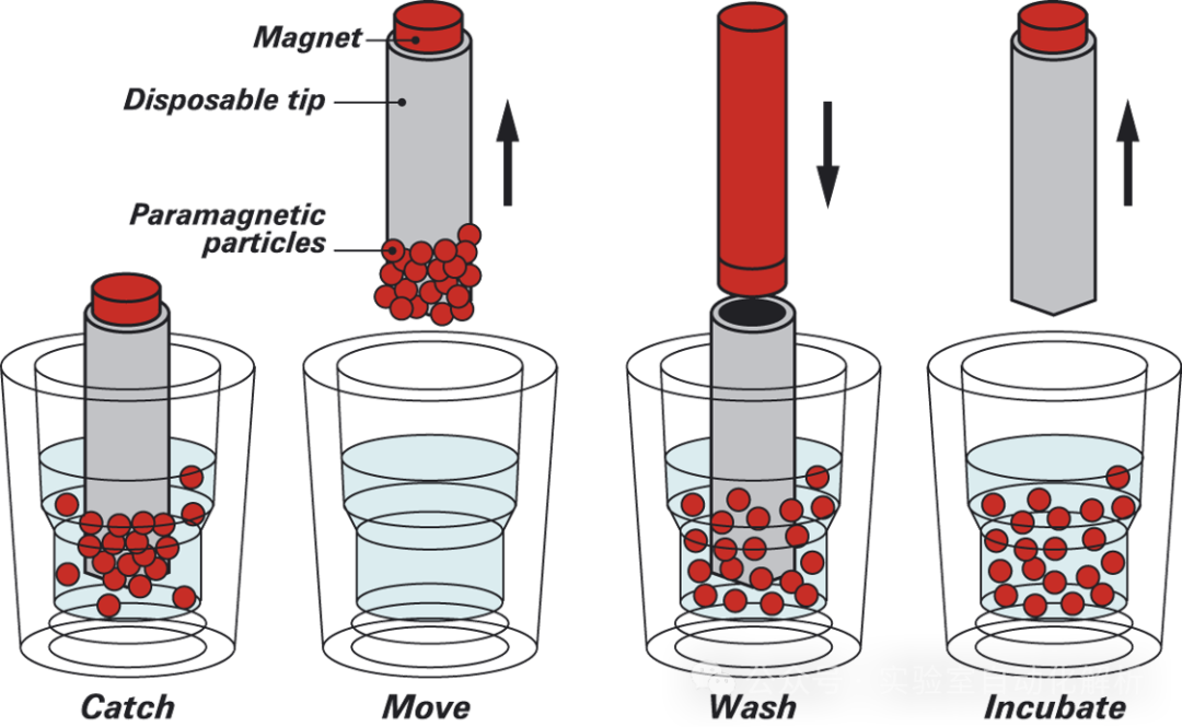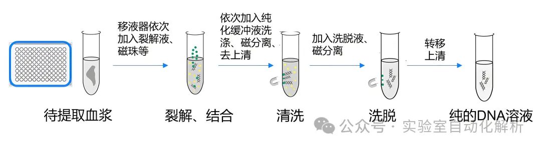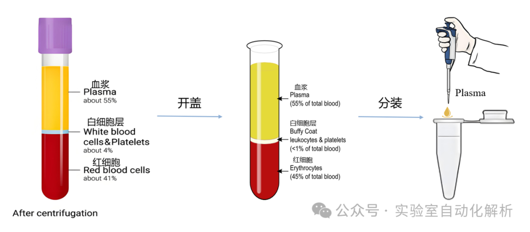 NIPT的检测流程通常涵盖以下步骤:(1)血液样本的采集与保存;(2)血浆分离,即血液样本的前处理,从全血样本中分离得到上层血浆;(3)DNA提取,即从血浆中提取核酸;(4)文库构建,通常遵循全基因组文库的构建流程;(5)文库质控,确保文库的可靠性;(6)Pooling,即将不同的DNA文库按照一定的规则进行混合;(7)上机测序,即将混合后的pooling文库进行测序操作,从而降低测序成本,提高测序通量;(8)生物信息学分析,即对测序结果进行数据分析。这一系列精确而有序的操作确保了检测的准确性和高效性。 在实验室常规处理流程中,主要包括以下几个环节:血浆分离、DNA提取、文库构建、文库质控、Pooling,随后是上机测序和生物信息学分析。在这些环节中,上机测序前的步骤通常被统称为“湿实验”,这些环节对自动化的需求尤为迫切。 血浆分离 血浆,作为抗凝全血经过离心后获得的上层清液,富含纤维蛋白原及其他凝血因子。由于其保留了血液成分的原始状态,并且产量优于血清,血浆在血液成分检测领域得到了广泛应用。这一特性使得血浆成为临床诊断和研究中的重要样本类型。 为了进行血浆中游离核酸的测序,所需的血浆必须高度纯净,避免母体基因组DNA的干扰。因此,在血浆分离过程中,必须严格避免接触白膜层。同时,为了确保实验的顺利进行,所需的血浆量相对较大,通常需达到500μL-1mL以上(因此,在血浆分离和提取阶段,操作通常采用离心管进行。而到了文库构建环节,由于所需体系体积较小,PCR管成为更合适的选择。这一转换过程,从大体积离心管到小体积PCR管的操作,可能会为实验人员带来一定的操作不便)。 一般推荐的血浆分离方法是两步离心法。孕妇外周血在4℃条件下进行1600× 分离完的血浆样本可在-20℃暂存1周,应避免反复冻融,可在-70℃以下长期保存。此步骤操作应双人复核标本信息。正常血浆呈透亮的黄色或淡黄色,无明显溶血;如有严重溶血或颜色异常等情形,须登记注明标本状态并重新采血。 痛点分析 在血浆分离过程中,为确保游离核酸测序结果的精确性,必须获得高度纯净的血浆,避免母体基因组DNA的污染。这一过程要求操作人员极为细心,严格避免触及白膜层,这是一项对技术熟练度有较高要求的专业操作,对于初学者而言,具有一定的挑战性。 自动化解决方案 在当前自动化血液样本组分分装领域,已知的有Hamilton EasyBlood高分辨成像血液分装系统,它专长于对离心后的全血样本进行血浆和白膜层的自动识别与分装。此外,Hamilton EasyBlood系统具备与自动化开盖机和二维码阅读模块(Hamilton LabElite IDCapper)的无缝整合能力,能够实现血液样本管条码识别、分层界面识别、吸取、分装、留样以及开关盖等操作的全面自动化。 这款设备我尚未亲自体验,非常欢迎那些已经使用过的朋友们留下您的宝贵意见,分享您的使用体验。 在处理大批量样本时,人工开启样本管盖的操作不仅繁琐,而且极为耗时。因此,采用自动化仪器进行样本管的自动开盖,能够显著提升工作效率,成为更为理想的选择。另外,自动化操作流程中,将血浆直接分装至深孔板,可简化后续的提取步骤,提高实验操作的便捷性和效率。尽管如此,剩余的样本仍需分装至EP管中,以便进行妥善保存。 DNA提取 DNA提取技术多样化,在市场上广泛应用的提取方法主要有磁珠法、硅胶膜离心柱法等。其中,磁珠法在核酸提取过程中表现出较高的自动化兼容性,使得操作更加便捷和高效。 正如新型冠状病毒肺炎诊疗中新型冠状病毒核酸检测通量高、时效性要求高的特点,对核酸提取技术提出了新的要求——高效、便捷、大通量,原有的手工提取核酸的方法,已经很难满足大规模、高通量的实验要求,在这种背景下,自动化核酸提取应运而生。 磁珠法自动核酸提取技术已达到高度成熟,根据移液特点主要分为磁棒法和移液法两种类型,前者转移的是磁珠,后者转移的是液体。 磁棒法自动核酸提取仪相对应用较多。以ThermoFisher KingFisher Flex系统为例,该设备利用特质的一次性磁套和磁棒进行操作,每批次能够高效处理24至96个样本。 操作流程包括将样本与功能化磁珠及试剂混合后,均匀分配至板孔中。在启动运行时,系统会自动装载磁套。仪器通过磁力作用从溶液中捕获磁珠,随后将其精准释放至含有下一步分离所需试剂的板孔内。这种磁珠的收集与转移机制,确保了洗涤过程的高效性、洗脱步骤的快速性以及整个处理流程的顺畅性。 相对于移液法,磁棒法的优点在于:(1)每一步的液体不会残留,因为磁棒只带走磁珠,然后转移到下一个步骤相应的反应孔中;(2)其编程简单,易维护,机器设备成本更低。 缺点就是不能将手动法磁珠提取试剂直接拿来使用,而需要根据机器特点优化试剂操作。 移液法自动核酸提取仪主要通过移液工作站来实现,如Beckman, Tecan, Hamilton等设备,它利用移液器精确转移液体,以完成核酸的分离与纯化。 相较于磁棒法,移液法的优势体现在:(1)移液过程中有效避免了液体滴落导至的交叉污染;(2)兼容多种磁珠法核酸提取试剂,几乎所有适用于手工操作的试剂均可在该类设备上使用。 然而,这种技术也存在一些不足之处:(1)容易在设备中残留废液,残留的洗涤液中的盐分和乙醇/异丙醇可能会影响后续的洗脱效率和PCR反应的成功率;(2)操作时间相对较长;(3)需要专业的编程和维护,导至设备成本较高,同时移液