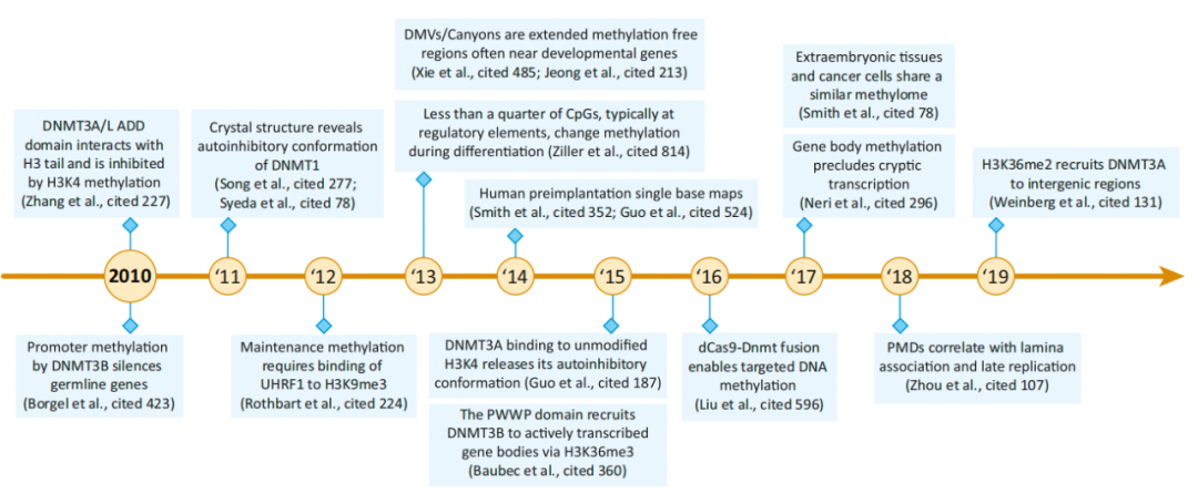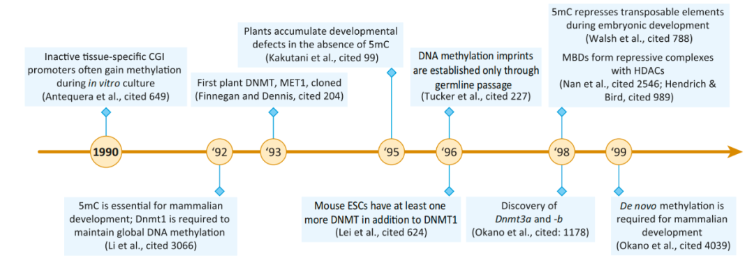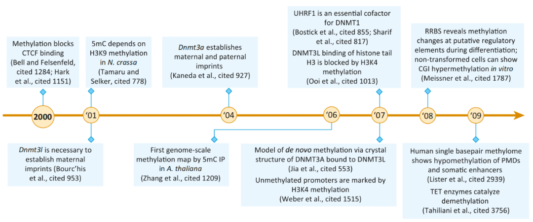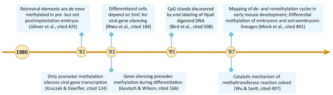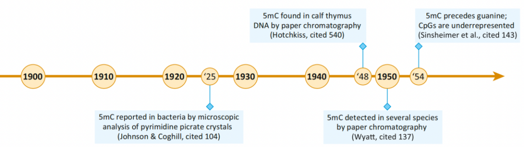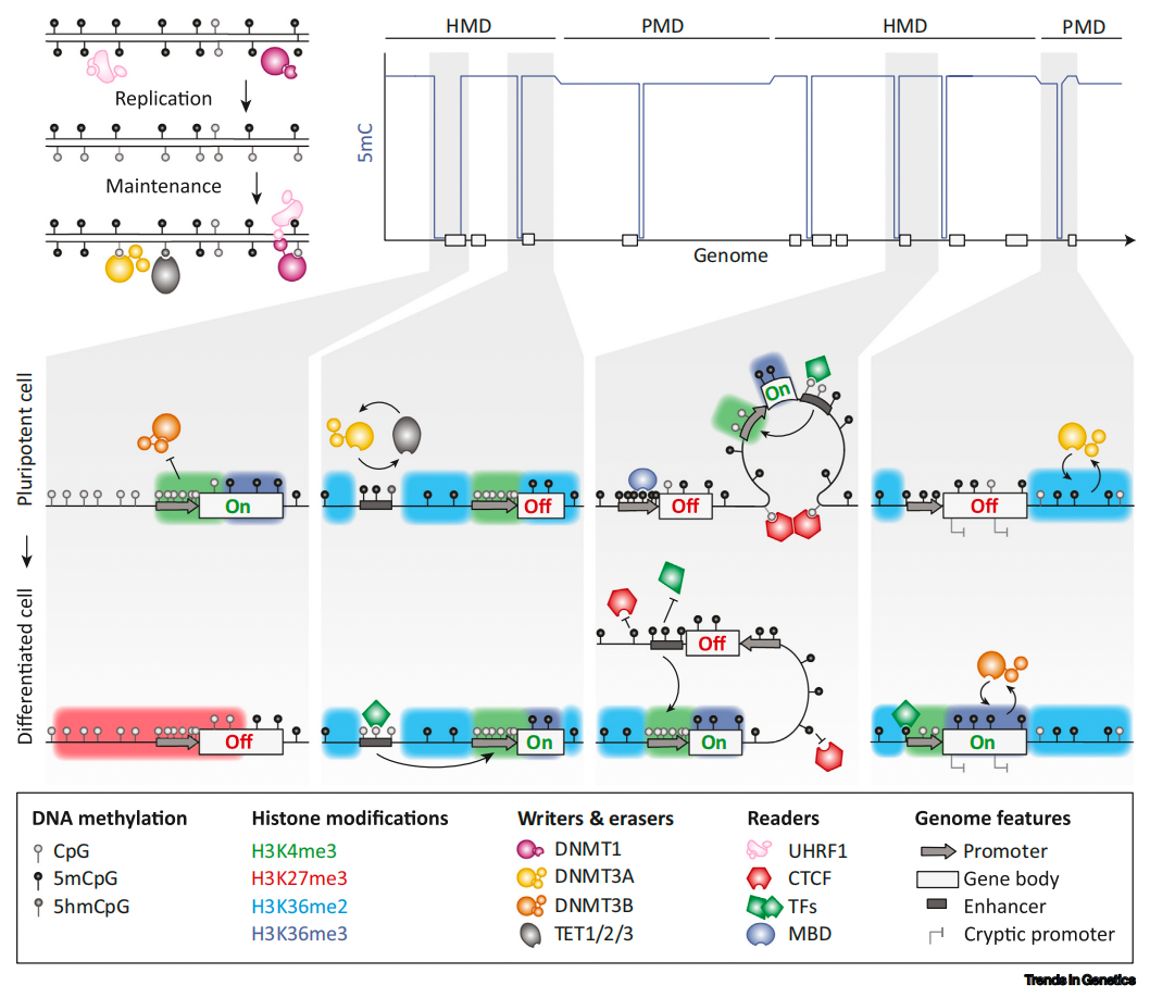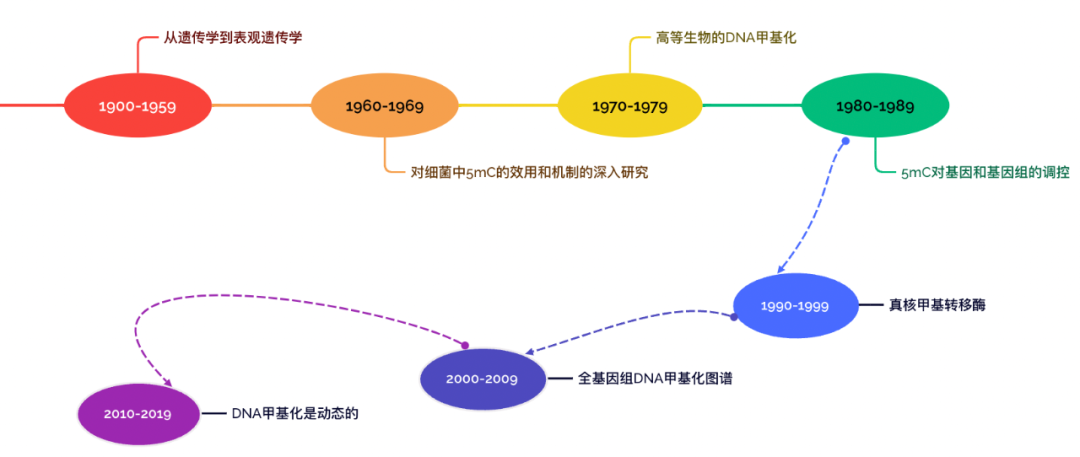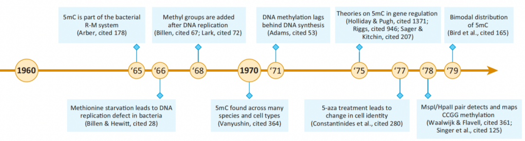 DNA甲基化研究发展的时间线 图1. DNA甲基化研究发展的时间线 DNA甲基化的发展历程 1900-1959:从遗传学到表观遗传学 1925年首次在结核分枝杆菌中发现5-甲基胞嘧啶,1948年通过纸层析法在小牛胸腺DNA中发现了5mC,两年后,证实了5mC在哺乳动物、昆虫和植物DNA中大量存在。1954年发现,5mC不是随机分布在DNA中,而是在CpG二核苷酸序列环境中特异发现的。 图2. 5mC发现的时间轴 1960-1979:对细菌中5mC的效用和机制的深入研究及高等生物的DNA甲基化 在此阶段发现了细菌的限制-修饰系统(R-M系统),其中甲基化敏感的“限制性内切酶”通过消化病毒的DNA来保护细菌宿主免受入侵病毒的侵害。除了在宿主保护中的作用外,还观察到细菌DNA甲基化与DNA复制之间的联系。 20世纪70年代,关于DNA甲基化在基因调控中的作用的研究和假设模型都取得了显著进展。改进的5mC检测方法实现了位点特异性甲基化分析,成为该领域的主要加速器。在本世纪末,该领域对物种内和物种间的DNA甲基化有了很好的认识,DNA甲基化作为基因表达的抑制因子被普遍接受。 图3. 稳定甲基化模式的传播及其功能的初步理论 1980-1989: 5mC对基因和基因组的调控 20世纪80年代发现5mC的甲基化DNA的片段被非甲基化DNA的片段打断,每段片段占据不同的染色质部分。尽管精子总体上是高度甲基化的,但在精子细胞的组成表达基因中,可以看到像早期后生动物胚胎中发现的低甲基化延伸。随后的研究表明,这些未甲基化的区域由富含CpG的DNA组成,并且在许多小鼠组织中保持未甲基化,后来正式命名为CGI。1988年成功克隆出小鼠DNA甲基转移酶1 (Dnmt1),这是第一个哺乳动物DNA甲基转移酶。 图4. 启动子甲基化和CpG岛的发现 1990-1999:真核甲基转移酶 20世纪90年代,对基因组印迹和X染色体失活等现象的分子理解取得了重大进展,此外,一系列研究鉴定、克隆和敲除哺乳动物的甲基转移酶,揭示了它们在发育过程中的重要作用。1993年发表了DNA甲基转移酶M.HhaI的第一个晶体结构,同年科学家利用与小鼠和细菌甲基转移酶的序列同源性,鉴定并克隆了第一个植物DNA甲基转移酶MET1。 哺乳动物和植物DNA甲基转移酶和具有甲基结合结构域的5mC读取器的功能评估以及转录抑制的研究在20世纪90年代明确定义了。活跃的DNA是否以及如何发生甲基化,仍然没有明确的机制。 图5. 真核生物DNA甲基转移酶的发现和鉴定 2000-2009:全基因组DNA甲基化图谱 21世纪初,随着拟南芥、小鼠和人类基因组组装草图的完成,生物科学发生了重大转变。这些基因组图谱反过来又使研究表观基因组的其他层面成为可能,1992年首次报道的亚硫酸盐测序技术,成为量化和定位甲基化的金标准。2000年代中期在拟南芥中完成了第一个全基因组甲基化图谱,发现基因的5 '端大部分缺乏CpG甲基化,而组成表达基因的主体则广泛甲基化,CpG相对减少。 Bestor和Schübeler实验室使用类似的基于富集的技术创建了第一个人类DNA甲基化的综合图谱。Saxonov及其同事对人类基因组进行了计算分析,揭示了两类启动子:低CpG (LCG, 30%的启动子)和高CpG (HCG, 70%的启动子)密度启动子。与LCG启动子相关的基因往往具有独立于其启动子甲基化的转录潜力,并且大多数这些启动子通常被甲基化。相比之下,大多数HCG启动子被发现是未甲基化的。 图6. 组蛋白修饰与5-甲基胞嘧啶(5mC)以及TET酶主动去甲基化的相互作用 2010-2019: DNA甲基化是动态的 测序技术的灵敏度、通量和可及性的提高使得一系列新的图谱研究成为可能,这些研究为许多新的见解提供了基础。陆续发现了DNA甲基化峡谷(dmv)、DNMT的变构调节、新的DNMT招募和靶点等。 更全面的5mC图谱改进了对高甲基化结构域(HMD)和部分甲基化结构域(PMD)的独特全局结构的描述。虽然PMDs可以在大多数健康细胞类型中检测到,但衰老、癌变和胚胎外组织都显示PMDs中甲基化水平进一步降低。结合结构研究,我们对DNMT的募集和活性以及DNA甲基化对基因调控的影响有了详细的了解。 图7. DNMT的招募机制和全局甲基化结构 结论 本综述提供了DNA甲基化领域从开始到现在的研究历程概述,并着重记录了该领域具有创新和巨大进步的关键实验,许多核心概念是在20世纪90年代建立起来的,最近的发现继续增加了新的见解(图8)。自从我们在细菌中发现5mC以来,对甲基化的研究持续了近一个世纪,DNA甲基化现在经常被用作研究其他生物过程和疾病表型的工具。尽管如此,仍有一些问题需要在未来解决。 图8. 哺乳动物DNA甲基化基因调控的关键概念 |