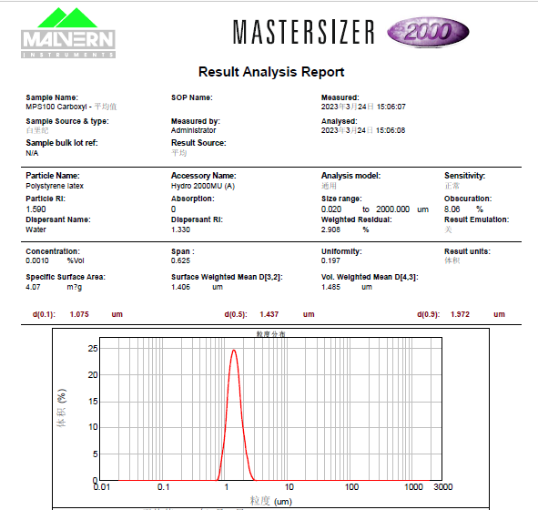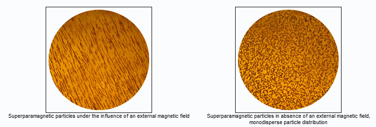 超顺磁性行为有两个最重要的特点:一是如果以磁化强度M为纵坐标,以H/T为横坐标作图(H是所施加的磁场强度,T是绝对温度),则在单畴颗粒集合体出现超顺磁性的温度范围内,分别在不同的温度下测量其磁化曲线,这些磁化曲线必定是重合在一起的。二是不会出现磁滞,即集合体的剩磁和矫顽力都为零。当铁磁体或亚铁磁体的尺寸足够小的时候,由于热骚动影响,这些纳米粒子会随机地改变方向。假设没有外磁场,则通常它们不会表现出磁性。但是,假设施加外磁场,则会被磁化,就像顺磁性一样,而且磁化率超大于顺磁体的磁化率。 磁性微球的粒径是重要指标之一,可以通过SEM(扫描电镜)、TEM(透射电镜)和NIST(美国国家标准与技术研究院)测试粒径等进行分析。当然宏观上,我们可以通过马尔文粒度分布仪进行测量。