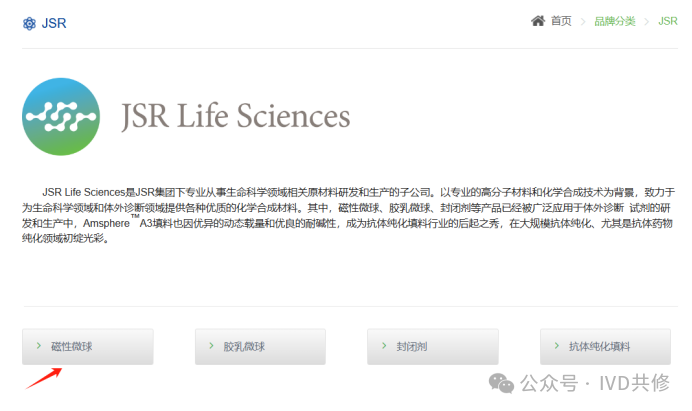 进入主页后选择品牌分类“JSR life sciences”磁性微球进行查询。