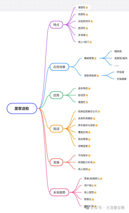规定居家医学检验外送有自采送检和上门采样送检2种服务模式。 整体的服务链条为:居家医学检验外送服务全链条包括第三方平台、采样产品供应方、医学检验实验室、物流服务方和用户。 整个服务是由第三方平台整合采样产品供应方、医学检验实验室和物流服务方为用户提供全链条服务。 居家医学检验外送服务特点: 便捷性:足不出户,用户只需要等待上门采样或者自采后送检即可,适用于不方便/无法独自就医人群。 快速性:大部分居家医学检验外送服务能够在数小时内提供结果。 诊医药闭环:使用第三方平台的线上问诊服务,通过对检测结果的解读,给出用药建议,用户通过第三方平台在线买药,等待配送。 舒适性:相较医院的等待检测,看诊,居家医学检验无需患者在医院等待。 多领域:涉及多个健康领域,包括上门采样送检的慢性病管理、自采送检的呼吸道病原体检测、生殖健康检测等。 线上+线下组合:和传统医院全部线下不同,用户通过线上下单,线下采样和送检,再从线上获得检测结果。 居家医学检验外送服务应用场景: 慢性病管理,血糖检测:糖尿病患者检测血糖水平。 尿酸检测:高尿酸/痛风患者送检评估血尿酸水平。 感染性疾病检测: 呼吸道病原体检测:检测鼻咽/口咽拭子中呼吸道病原体。检测常见呼吸道病原体核酸如流感病毒,肺炎支原体,鼻病毒等。 呼吸道疾病高发季节,医院检测能力无法满足检测需求或等待检测,看诊时间过长,亦或患者不便去医院就诊可使用居家医学检验外送服务。 生殖健康检测:检测生殖道拭子/宫颈拭子中的生殖道病原体,如沙眼衣原体,淋球菌,毛滴虫等。 居家医学检验外送服务优势: 降低成本:目前居家医学检验外送服务呼吸道和生殖健康检测的检测费用均较低。目前呼吸道检测为第一单为69.9元,后续为99.9元,而生殖道检测也仅为39.9元,这直接降低用户成本支出,也降低医疗资金支出。 便捷性:用户可居家并在不同时间,体验样本的检验外送服务,在线结果汇报,且时间较快(数小时)。 舒适性:关键是用户不用排队等待检测。提升用户体验与舒适度,节省用户时间,减少如呼吸道传染病的交叉感染风险。 居家医学检验外送服务挑战: 检测结果医院是否认可:目前仅有少部分医院认可居家医学检验外送服务汇报的结果,并且依据此结果结合临床指征看诊,开具药品。 自采样准确性:生殖健康检测与呼吸道病原体检测均采取用户自采样的方式,根据行标,鼻咽拭子采样应经历5步。因此用户自采样准确性是否能够得到保证,值得质疑。 样本保存和送检是否遵守规定:根据最新居家医学检验外送服务规范对标本送检要求做出规定,但运输过程并非专业人员执行,所以对送检规定是否能严格执行提出质疑。 医学检验室覆盖区域:目前居家医学检验外送服务,是依靠有资质医学检验实验室完成样本检测和结果上传。因此医学检验实验室的分布和数量就成为开展此业务重要支撑。 但我国各城市之间医学检验实验室分布不均,数量不一,这可能是制约此业务发展的因素。 使用检测试剂及仪器是的质量管理:居家医学检验外送服务团标中,尚未对医学检验实验室所使用的仪器和试剂获得NMPA认证进行要求。同时对于使用仪器和试剂的质量管理也尚未说明。 政策监管:虽然居家医学检验外送服务团标已然实施,但是行标,国标以及对于相关业务的法律法规暂无。因此后续政策及监管可能亦是制约其发展的因素。 居家医学检验外送服务在中国的应用与发展: 市场增长:随着人民对于医疗检测需求的增加,会有更多的人群基于便捷性、舒适性、快速性等优势及特点选择居家医学检验外送服务。 医院检测能力的有力补充:2023年呼吸道疾病爆发导至居家医学检验外送服务开始出现,其解决医院检测能力不足,等待时间、检测时间过长与人民群众急切检测,看诊之间的矛盾。因此今后居家医学检验外送服务依然是医院检测能力的有力补充。 线上医院(互联网医院):随着有更多新项目被纳入居家医学检验外送服务,线上检验+线上问诊+在线买药的线上医院有可能成为其后续业务发展的主要方向。 居家医学检验外送服务未来趋势: 以疾病和患者为中心的服务模式:即通过在线看诊由线上医生开具检测,以上门采样为主,帮助患者监控、诊断、预防疾病、动态调整药物。 以用户为核心的服务模式:即用户通过自我感知自行下单,以自行采样为主。目的帮助用户诊断、监控疾病。 线上医院(互联网医院):通过第三方平台外送至指定的检验实验室进行医学检验,结果汇报,线上问诊,用药建议,买药服务,配送服务等完成诊医药的闭环。因此后续线上医院以完成闭环流程或许是居家医学检验外送服务未来趋势。 数智化:通过手机小程序、APP等方式汇报检测结果、根据检测结果做出健康预警/提示、给出应对方案(如提醒就医、复查、服药等)。 双向扩张:未来居家医学检验外送服务或许会迎来双向扩张。 扩张一:当业务体量增大、业务范围增加,原有医学检验室覆盖范围和检测能力无法匹配需求时,第三方平台在满足检测需求和降低成本的双重驱动下,自行成立医学检验室涉足检验服务,甚至入主、收购IVD试剂/仪器企业,完成全服务链条的闭环。 扩张二:连锁医学检验室,或有医学检验服务的IVD等企业,为了更大利润,从而跳脱原有的服务链条,通过小程序,APP提供
