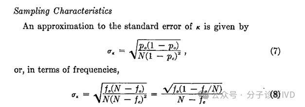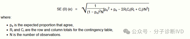 在诊断试验中,一种新的体外诊断试剂通常与金标准或已上市同类产品进行一致性比对,以评价两种检测方法结果是否一致。通常,在统计方法选择上,我们会优先选择Kappa一致性检验。Kappa是用来描述定性(分类)任务中标注一致性的统计量。 Cohen's Kappa和Fleiss' Kappa是比较常见的Kappa,Cohen's kappa 和 Fleiss' kappa 是两种以人名命名的统计学方法。前者只能用来评估两位观察者之间的一致性,如评价考核试剂检测结果与已上市同类产品的一致性,后者可以衡量多个观察者对多个对象进行分类时的一致性程度。在IVD临床试验中,主要使用Cohen's Kappa进行一致性分析,因此,本文将重点介绍。 1.Cohen's Kappa 1960年Cohen等发表了"A coefficient of agreement for nominal scales"一文,首先提出用Kappa值作为评价一致性程度的指标。他提出的Kappa标准误计算公式(1960年Cohen)为: 后来,有学者提出以上标准误计算公式有误,如Everitt,1968年试图修正,但他的计算公式也同样存在错误。 直到1969年,Fleiss, Cohen 和Everitt三大巨头强强联合,发表了"Large Sample Standard Errors Of Kappa and Weighted Kappa"的重要论文,对标准误计算公式进行了修正。在论文中根据原假设不同,Kappa值标准误采用不同计算公式。如原假设为κ = 0,标准误计算公式为: 2.Kappa值标准误计算现状 值得一提的是,目前国内关于Kappa值标准误的计算也基本上分为两派。一派采用Cohen(1960)计算方法,该方法计算简单,易于被大家所接受;一派采用Fleiss(1969)计算方法。但通常来说统计专业人员更倾向于选择Fleiss(1969)计算方法。 在《对诊断一致性kappa系数及评价指标的探讨》一文中,Kappa系数的标准误Sk也被写成: 实际上,这种写法与前者是一致的,只不过前者使用频数,后者使用频率进行计算。 在《Kappa一致性检验在检验医学研究中的应用》一文中,Kappa系数的标准误Sk被写成: 总之,以上两种方法目前均有在使用,具体使用哪种方法读者可自行选择。 参考文献 [1] Cohen, J. (1960). A coefficient of agreement for nominal scales. Educational and Psychological Measurement, 20, 37–46. [2]Fleiss, J. L., Cohen, J., & Everitt, B. S. (1969). Large sample standard errors of kappa and weighted kappa. Psychological Bulletin, 72(5), 323–327 [3]闫岩,华琳,张建. 对诊断一致性kappa系数及评价指标的探讨[J]. 中国卫生统计,2007,24(3):313-315. [4]夏邦世,吴金华. Kappa一致性检验在检验医学研究中的应用[J]. 中华检验医学杂志,2006,29(1):83-84. |