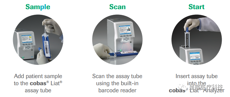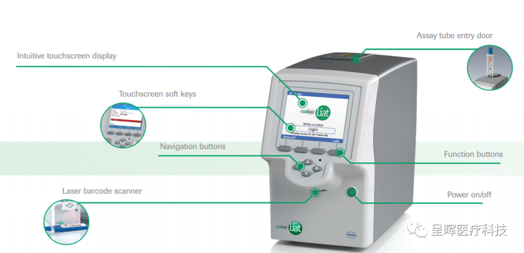 从注册时间线来看,2014年IQuum被收购后,Liat平台上的注册产品基本就很少了,从2014年到2021年里基本都是躺平状态,2021年2月当Liat拿到流感合胞联检的时候,Cepheid的新冠检测试剂盒已经在市场上卖了整整一年,2024年流感合胞新冠四合一拿证的时候,新冠核酸检测潮也早已落幕。不得不说,Liat在这波疫情之中确实没捞着啥。1.1 cobas® Liat®分析仪Cobas®Liat®分析仪是具备创新功能的PCR分子诊断POCT平台。分析仪采用硬件按钮和触控板相结合的方式进行控制,测试管同时作为拭子的保存管,从分析仪的顶部插口放入,仅能装载一个样本。