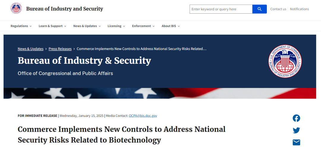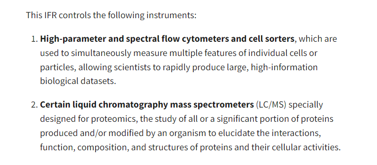 2025年1月16日,美国商务部工业与安全局 (BIS) 在联邦公报中发布了新规则,未经美国许可,任何公司和个人均被禁止向中国及其他国家出口一些类别的流式细胞仪和质谱仪。 美国工业与安全局 (BIS) 通过一项临时最终规则 (IFR) 修订《出口管制条例》 (EAR),对某些实验室仪器实施有针对性的出口管制。美国认为,确保生物技术的负责任使用,尤其是在与人工智能(AI)和数据科学相结合的情况下,对于保障公共卫生、农业和食品生产以及环境至关重要。同时,鉴于生物技术的使用,特别是与人工智能和生物设计工具相结合时,有可能增强受关注国家的军事能力并对美国国家安全构成威胁,美国需要应对生物技术带来的益处和风险。本临时最终规则所管控的仪器非常适合生成大量详细的生物数据集,这些数据集经过分析可以发现控制生物分子、细胞和生物体功能的复杂模式。这些信息具有广泛的民用和商业用途。然而,有证据表明,某些国家正在积极寻求利用这些技术获得不对称军事优势的战略。1、高参数和光谱流式细胞仪及细胞分选仪,用于同时测量单个细胞或颗粒的多个特征,使科学家能够快速生成大量高信息量的生物数据集。 2、某些专门用于蛋白质组学(即研究由生物体产生和/或修饰的所有或大部分蛋白质,以阐明蛋白质及其细胞活动的相互作用、功能、组成和结构)的液相色谱质谱联用仪(LC/MS)。原文链接:https://www.bis.gov/press-release/commerce-implements-new-controls-address-national-security-risks-related