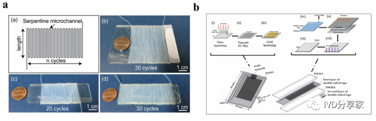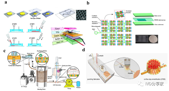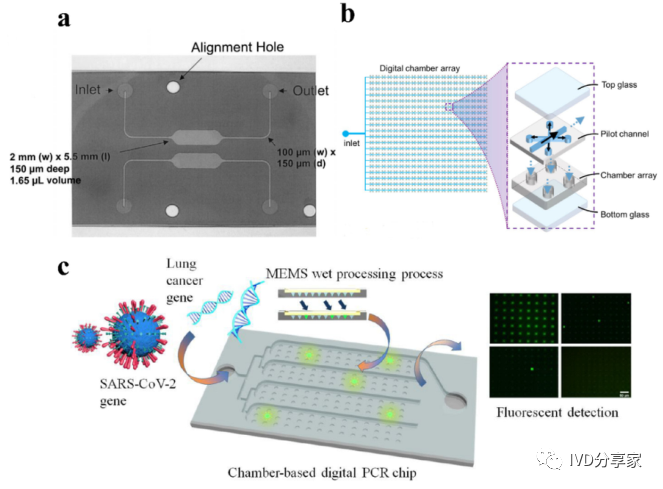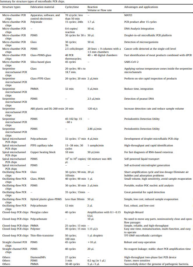 微流控PCR芯片概览 2、结合qPCR的微流控芯片 3、结合mPCR的微流控芯片 4、结合dPCR的微流控芯片 ddPCR技术将PCR反应液分成大量的纳升至皮升,同时在这些小液滴中进行PCR扩增,分析扩增后液滴的荧光信号,计算出目的基因的拷贝数。以液滴为反应单元的PCR系统系统结构更简单,成本更低,结果更准确。Chen等人使用水相通过微通道阵列分散成稳定的油包水乳液液滴,并进行高动态范围的dPCR反应。事实证明,这种经济有效的方法不仅节省了复杂的微流控设备和控制系统,而且大大抑制了材料损失和交叉污染。此外,Wang等人使用压缩空气驱动流体产生液滴,无需外部微阀即可实现实时监测。该系统只需要一个恒温加热器即可实现dPCR所需的稳定热循环,实现每个热循环中液滴荧光的实时检测,简化了传统的dPCR过程。 在现有的一些ddPCR系统中,液滴发生器产生液滴后,需要将液滴转移到其他模块进行扩增和检测,可能会导至转移过程中液滴丢失,结果不准确。在转移过程中存在交叉污染的风险。如张等人采用喷墨打印技术,在油相中产生单分散液滴,然后稳定分散到毛细管中,简化了乳化过程,大大减少了试剂的损失,且生成的液滴在不同温度下是连续的。该方法应用于携带目标DNA的阳性液滴,并利用该系统对三个数量级不同数量的DNA进行定量评估。Wei等人开发了一种新型 dPCR 芯片,它将液滴产生、液滴阵列自组装、PCR 扩增和荧光检测集成到一个设备中。它的特点是制造成本极低、定量能力强且有小型化的潜力,满足DNA分子定量标准。 随着微流控技术的成熟,基于微流控技术的dPCR技术发展迅速。两者结合可以避免繁琐的样品分散操作,在短时间内自动形成一大型的独立反应单元,通量高,提高了准确度和灵敏度。与传统的qPCR技术相比,dPCR技术具有极高的灵敏度、精密度和特异性,特别适用于细微的拷贝数变异、稀有基因突变和核酸绝对定量。广泛应用于医疗、微生物检测、食品安全等领域。 微流控PCR芯片的结构类型 不同样式的微流控PCR芯片的示意图。红色表示变性,蓝色表示退火,黄色表示延伸 1、Micro-chamber PCR chips 3、Spiral microchannel PCR chips 4、Oscillating-flow PCR chips 5、 Closed-loop PCR chips 6、Straight channel PCR chips 7、Others PCR chips 微流控PCR芯片的应用 随着微流控技术的快速发展,微流控PCR芯片正朝着结果简单、功能集成、便携和一次性的方向发展。微流控PCR芯片现在被用于识别病原体、核酸病毒和基因突变,以及预测和诊断疾病和检测低浓度样品。COVID-19正在席卷全球,尤其是现在。我们的共同目标是创造既便携又集成的核酸检测技术。微流控PCR芯片技术的进步,赋予了生物、医学等领域巨大的应用价值。 1、与病原体检测相关的微流控PCR芯片 2、与核酸病毒检测相关的微流控PCR芯片 3、基因突变检测相关的微流控PCR芯片 4、与疾病预防和诊断相关的微流控PCR芯片 5、与DNA甲基化检测相关的微流控PCR芯片 6、与低丰度样品检测相关的微流控PCR芯片 结论和未来展望 尽管典型的PCR反应过程简单明了,化学扩增效果明显,但对硬件条件的依赖仍然是PCR广泛使用的一个重要障碍。提高热循环率、最小化设备和使用更少的化学品需要进一步开发。传统的台式热循环仪仪器体积大,试剂消耗大,导至系统热容量增加,进而降低了温度转变速率和反应速率。这些缺陷可以通过PCR设备的小型化来解决。近几十年来,微流控PCR设备的发展有了很大的进步,改变了传统的核酸扩增PCR方法体积大、成本高、耗散大、易污染和降解等问题。热传导速度加快,提高了热循环的效率。 微流控PCR已与多种检测方法相结合。其中,荧光检测是最灵敏、最方便的检测方法。开发低成本、高通量、高速的检测方法是未来研究的重点。系统集成和自动化可以减少手工操作、减少交叉污染及试剂和样本消耗。在COVID-19的趋势下,集自动化和小型化于一体的检测平台是未来的发展方向。 本综述讨论了PCR技术(PCR、RT-PCR、dPCR、mPCR)与微流控芯片上各种通道结构的结合,并介绍了相关的检测方法。还总结了一些已报道的生物分子分析应用,由于芯片加工制造平台还不够普及,微流控PCR技术设备仍需要更好的改进。核酸提取、扩增和检测的一体化将是未来研究的重要方向。 本研究得到国家自然科学基金面上项目(81973569, 21727814, 21621003, 82130113)、四川省科技厅重大专项(2019YFSY0046)、四川省科技厅区域创新合作项(2020YFQ0032)等资助。 原文链接:https://doi.org/10.1016/j.trac.2022.116737 |