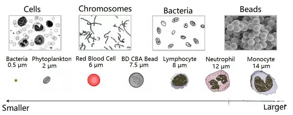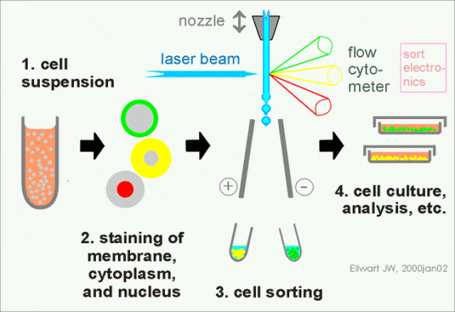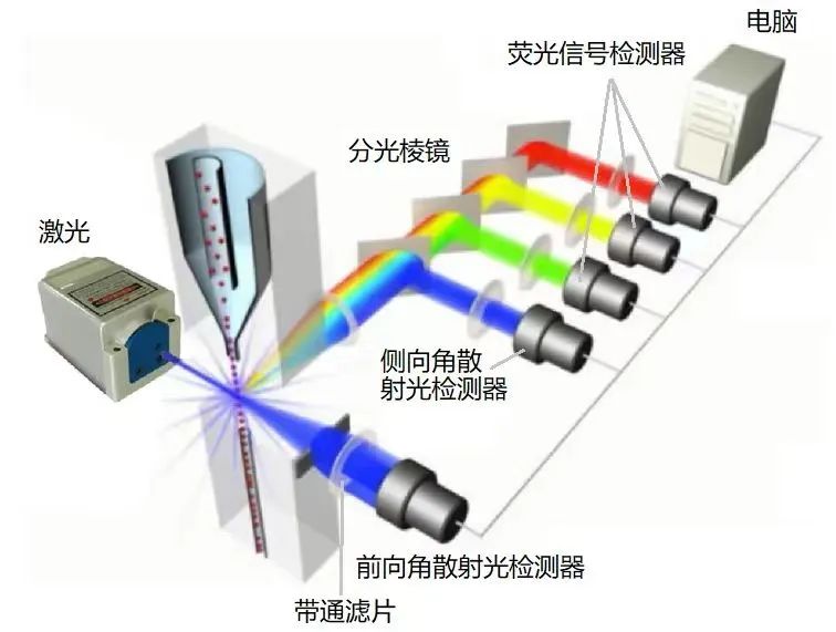 流式细胞术(Flow Cytometry,FCM)从字面意义理解,Flow—Fluid、Cyto—Cell、Metry—Measurement,是一种对液流中排成单列的细胞或其它生物微粒(如微球,细菌,小型模式生物等)逐个进行快速定量分析和分选的技术。其特点是通过快速测定库尔特电阻、荧光、光散射和光吸收来定量测定细胞DNA含量、细胞体积、蛋白质含量、酶活性、细胞膜受体和表面抗原等许多重要参数。根据这些参数将不同性质的细胞分开,以获得供生物学和医学研究用的纯细胞群体。广泛运用于从基础研究到临床实践的各个方面,涵盖了细胞生物学、免疫学、血液学、肿瘤学、药理学、遗传学及临床检验等领域,在各学科中发挥着重要的作用。 特定波长的激光束直接照射到高压驱动的液流内的细胞,产生的光信号被多个接收器所接收,包括激光束直线方向上接收到的散射光信号(前向角散射)和激光束垂直方向上接收到的光信号(散射光信号(侧向角散射)和荧光信号)。液流中悬浮的直径从0.2-150 μm的细胞或颗粒能够使激光束发生散射,细胞上结合的荧光化合物被激光激发后能够发射荧光。散射光信号和荧光信号被相应的接收器接收,根据接受到的信号的强弱从而反映每个细胞的物理学特征。 将待测样品制成单细胞悬液,在鞘液的包裹下进入流式细胞仪内的检测区域,细胞在激光的照射下会发生散射和折射,产生的散射光信号和荧光信号由不同的通道接收。其中前向角散射光(FSC)的强度与细胞直径成正相关,可以理解为细胞直径越大,FSC越强,细胞直径越小,FSC越弱。所以可以利用细胞的FSC值初步比较细胞的大小,利用FSC值对细胞进行分群和分类。 侧向角散射光(SSC)的强度与细胞内颗粒结构复杂程度成正相关(与细胞中所含的细胞器、细胞核等的数量成正比),可以理解为细胞内颗粒结构越复杂,SSC越强;细胞内颗粒结构越简单,SSC越弱。所以可以利用细胞的SSC值初步比较细胞的颗粒度,利用SSC值对细胞进行分群和分类。 当细胞通过激光束时,检测器会检测到细胞或颗粒的散射光,放置在前面的检测器检测FSC值,而放置在侧面的多个检测器检测SSC值。通过综合分析前向散射FSC和侧向散射SSC的数据,便能根据细胞大小、形状和复杂度将其进行分群分类。由于样品细胞不需要标记任何荧光化合物偶联抗体,直接上样分析得到FSC值和SSC值,其值代表细胞的大小和颗粒度两个物理特征,所以FSC-SSC散点图又称为 “物理图”。 当细胞悬液放入样品管中,被高压压入流动室内。流动室内充满鞘液,在鞘液的包裹和推动下,细胞被排成单列,以一定速度从流动室喷口喷出。在流动室的喷口上配有一个超高频的压电晶体,充电后振动,使喷出的液流断裂为均匀的液滴,待测细胞就分散在这些液滴之中。将这些液滴充以正、负不同的电荷,当液滴流经过带有几千伏的偏转板时,在高压电场的作用下偏转落入各自的收集容器中,没有充电的液滴落入中间的废液容器,从而实现细胞的分离。流式细胞仪除了根据FSC和SCC散射度或荧光(如DNA、RNA或蛋白含量,酶活性,特异抗原) 散射度差异来分离细胞外,更多的采用细胞表面抗原标记的荧光强度差异来分离细胞。每种细胞表面具有独特的抗原,当形态学检测难以区别时,免疫表型参数对细胞分选有决定性作用。