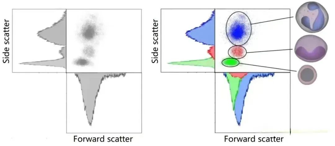 荧光信号和散射光信号通过波长选择的滤光片,由相应的光电管和电子检测器接收并转换成电信号,经放大器放大后送入计算机并进行分析显示和结果输出,测定的结果常用流式直方图、流式散点图、流式密度图和流式等高线图来表示。 流式细胞仪可检测多种样本:外周血、骨髓、细胞穿刺液、洗脱液、实体组织、培养细胞、微生物。 1.流式细胞术可以用来检测细胞表面以及胞内的各种标志,对细胞进行分群鉴定以及各种蛋白表达量高低的比较。 2.通过标记Ki67、BCL-2、caspases等增殖及凋亡相关基因,流式细胞术可用来检测细胞的增殖以及凋亡。 3.流式细胞术可用来分析细胞周期。细胞核DNA含量随着细胞增殖周期时相的不同而发生变化,用DNA染料进行染色,DNA含量多,荧光信号强,DNA含量少,荧光强度低。 4.在肿瘤学研究中尤其常用,流式细胞术可以用于判断药物对肿瘤细胞影响、肿瘤的生长速度等。