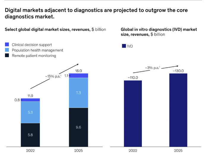 诊断的当前趋势 如今,诊断领域正从传统的后台付费服务角色向医疗保健服务生态系统中的关键利益相关者角色转变。有三个主要转变为数字和分析在体外诊断(IVD)行业的转型中创造了机会: 改进诊断测试本身:卫生系统期望在诊断方面实现两项主要改进。其一,为基于结果的医疗保健提供真正的测量指标,即超越简单的结果,将其与关键结果相联系。其二,将测量结果转化为见解提供给临床医生,结合当地环境、趋势和患者特定数据点,帮助医生做出更准确的护理决策。 转变护理服务:诊断作为临床决策的核心,是未来护理服务的关键组成部分。未来护理服务包含三个主要要素:一是新的护理模式,如家庭和虚拟护理,诊断需定义新工作流程和测试以实现远程护理且不牺牲质量;二是更加注重预防,需要新的 IVD 测试以更准确、经济地筛查患者;三是个性化医疗,IVD 参与者需筛选新诊断面板,让医生为患者选择正确疗法。 扩大医疗保健领域的诊断范围:诊断测试在疾病识别之外的广泛应用将对 IVD 参与者和社会产生重大影响。例如,可作为未来大流行病和卫生紧急情况的主要防线,还能提高药物开发的效率和有效性。 数字诊断将数据和分析与传统 IVD 测试相结合,产生新的临床见解和更高效的工作流程。麦肯锡的研究显示,与诊断相邻的部分数字市场,如临床决策支持、远程患者监测和人口健康管理,预计在未来几年将超越核心诊断市场。虽然其他参与者如健康科技和数据公司也关注这一领域,但 IVD 公司因其数据生成设备已融入关键临床工作流程,有权发挥作用并成为医疗保健服务生态系统中的关键利益相关者。 数字诊断中的适用范围 任何新的诊断测试或解决方案,无论是否数字化,都必须满足三个标准才能成功。 首先,新的数字诊断解决方案必须提供卫生系统领导者易于理解的价值,例如明显改善患者的治疗效果。虽然更好的敏感性和特异性有一定好处,但由于患者治疗过程中的效率低下和生物标志物的自然波动等因素,这些指标的增量改进通常难以转化为更好的结果。相反,确保正确使用诊断测试并促进其解释,同时应用患者和人群特定背景,能带来更大的结果改善。因此,探索数字诊断的第一步是确定 IVD 制造商可以在哪些方面提供差异化的临床价值,包括开发使用本地数据的筛查测试、提供长期健康跟踪和个性化治疗建议以及开发伴随诊断算法等。 其次,通常需要将整个患者旅程中的多个用例组合在一起才能提供价值。以胆固醇检测为例,数字诊断可利用风险评估长期整体健康状况,为患者提供量身定制的建议并跟踪结果,提供更好的护理。这需要多个使用案例的组合,如根据患者和人群调整的洞察、长期健康跟踪和个性化治疗建议以及家庭诊断和监测。诊断参与者需思考如何整合正确的用例并更广泛地参与健康之旅,可通过有机发展或合作伙伴关系及并购实现。 轻松集成到临床工作流程中 新的测试和解决方案若能无缝集成到现有工作流程中,或引入更简单、高效的工作流程,将更具优势。由于当前医疗保健环境面临工人短缺和倦怠问题,卫生系统不会对增加工作负担的新诊断系统感兴趣。 例如,一种筛查常见病症的家庭测试,要被采用需具备完整工作流程,包括将数据连接到电子病历、建立远程医疗连接并生成医生易理解的见解或报告。IVD 参与者可能无法拥有所有工作流程组件,需仔细评估参与的地点和方式,以确保工作流程顺利和最大程度的采用。 为卫生系统提供成本效益 考虑到卫生系统面临的通胀压力,成本在短期内应是重中之重。IVD 参与者需将硬性成本效益指标传达给医疗保健从业者、实验室和其他客户。 如何在数字健康生态系统中发挥作用 IVD 参与者不仅可以选择在患者旅程中增加价值的阶段,还可以选择如何在这些领域最好地提供数字诊断。 数据采集:许多 IVD 参与者已在收集数据,扩大 IVD 设备之间的连接以实现集中、标准化的数据收集,可提供更强大的数据集用于分析、了解趋势和管理人群,对实验室参与者尤其有价值。 数据集成:IVD 参与者可能缺少关键用例所需的所有数据,可考虑通过获取数据或充当中间件来组合数据源,为 IVD 制造商或客户解锁新用例。随着更多患者旅程的互联,数据集成的价值也在增加,其中诊断数据是关键组成部分之一。 数据产品:数据依赖型产品是诊断参与者较有经验的领域,如下一代测序、伴随诊断和液体活检。IVD 参与者还可创建面向客户的产品,改善临床决策、提供更好用户体验并简化操作,在分子诊断和蛋白质组学领域可能同样有价值。 数据服务:IVD 参与者在医疗技术参与者中可能处于有利地位,提供与设备实时数据配对的服务,可为临床管理、测试成本管理或预测维修提供巨大价值。 如何开始使用数字诊断 数字诊断具有挑战性,要求 IVD 参与者构建新能力、应对复杂的数据监管环境并阐明与客户产生共鸣的价值主张。以下五项举措为追求数字化诊断的成功战略奠定基础: 定义清晰数字战略:明确将数字解决方案与临床护理的有意义改进联系起来,从结果和成本角度出发,而非单纯考虑 “货币化”。 以客户为中心:让客户需求指导产品开发,涵盖应用程序、功能和基础设施,通过密切合作进行迭代,确保早期采用。 寻找合作伙伴:尽早找到合适伙伴进行大规模投资,弥补在云托管、网络安全
