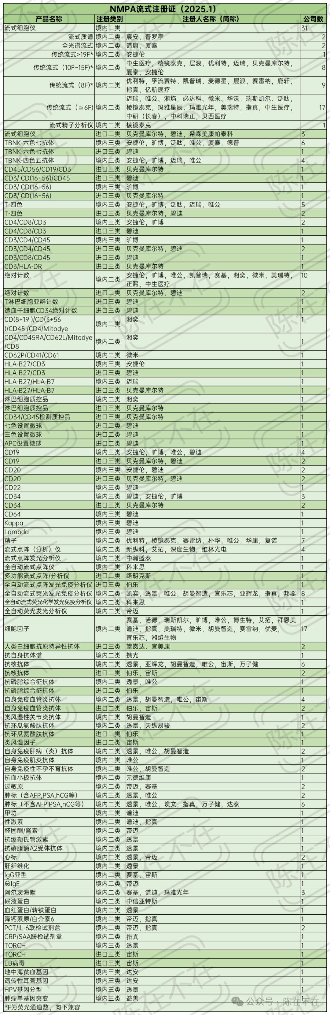 02 — 截止到2025年1月28日(甲辰年除夕),NMPA网站检索“流式”注册证,包括二类和三类:进口:52张,无新批注册证。一方面国外公司近年少有新的临床流式机型推出,另一方面,国际品牌选择在国内设厂生产试剂,实现国产化。境内:<380张(网站主页数据重复颇多)。新批三类注册证7张,新批二类注册证110+。新批证接近总数的三分之一,火爆的一年!- 细胞流式临床仪器公司已达33家,其中境内注册证公司31家,进口注册证公司3家。