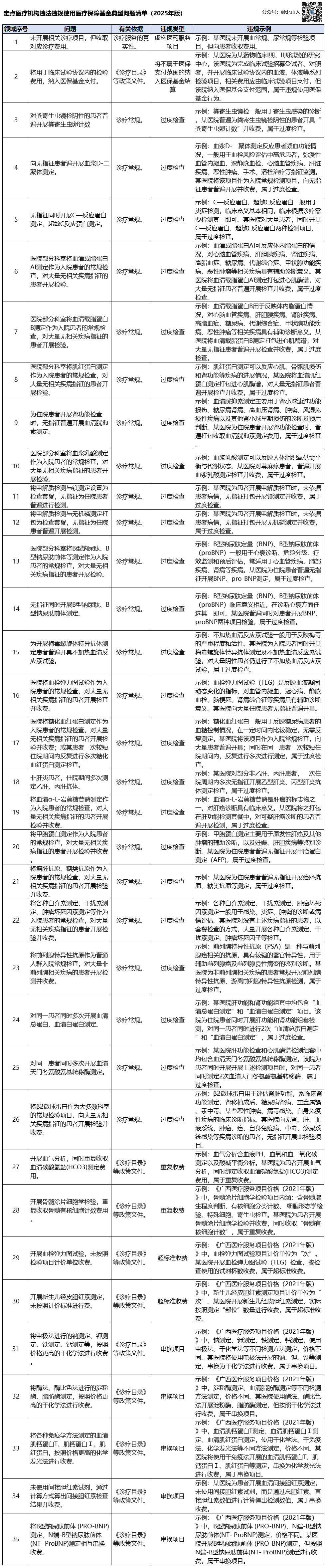 1、开展血气分析,同时重复收取血清碳酸氢盐(HCO3)测定费用2、开展骨髓涂片细胞学检验,重复收取骨髓有核细胞计数费用2、行“呼气试验(碳14)”检验,并未行幽门螺杆菌培养,收取“幽门螺杆菌培养及鉴定”费用1、未按临床规范和医嘱,将检测检验类项目组套开展,“粪便常规”与“粪寄生虫镜检”、“粪寄生虫卵集卵镜检”、“粪寄生虫卵计数”同时收费2、未按临床规范和医嘱,将检测检验类项目组套开展,开展血常规检查时,同时收取网织红细胞计数(Ret)费用的人次比例过高3、为开展“梅毒螺旋体特异抗体测定”患者普遍开具“不加热血清反应素试验”4、为住院患者普遍开具“血清果糖胺测定”,或一次住院多次检测5、开展尿常规检查时,同时收取尿液分析+尿沉渣定量费用6、细菌培养结果为阴性的情况下,仍收取“常规药敏定性试验”、“常规药敏定量试验”、“联合药物敏感试验”等费用7、“B型钠尿肽前体(PRO-BNP)测定”单日进行2次以上检测。(核减2次)8、过度检查、过度诊疗 同一次住院期间,非传染性疾病患者进行“乙型肝炎表面抗原测定(HBsAg)”、“乙型肝炎表面抗体测定(Anti-HBs)”、“乙型肝炎e抗原测定(HBeAg)”、“乙型肝炎e抗体测定(Anti-HBe)"、“乙型肝炎核心抗体测定(Anti-HBc)"、“丙型肝炎抗体测定(Anti-HCV)”、“人免疫缺陷病毒抗体测定(Anti-HIV)"、“梅毒螺旋体特异抗体测定”大于1次。9、同一次住院期间,收取"糖化血红蛋白测定"≥2次。(住院天数≥60天的患者除外)10、未按临床规范和医嘱,将检测检验类项目组套开展,如开展血常规检查时,同时收取血常规分项、嗜碱性粒细胞计数、异常白细胞计数、异常白细胞形态检查、嗜酸性粒细胞直接计数、有核红细胞计数等。12、未按诊疗规范,无指征开展“免疫组织化学染色诊断”3、无指征同时开展C一反应蛋白测定、超敏C反应蛋白测定4、医院部分科室将血清载脂蛋白AI测定作为入院患者的常规检查,对大量无相关疾病指征的患者开展检验5、医院部分科室将血清载脂蛋白B测定作为入院患者的常规检查,对大量无相关疾病指征的患者开展检验6、医院部分科室将血清肌红蛋白测定作为入院患者的常规检查,对大量无相关疾病指征的患者开展检验7、为住院患者开展肾功能检查时,无指征普遍开展血清胱抑素测定8、医院部分科室将血浆乳酸测定作为入院患者的常规检查,对大量无相关疾病指征的患者开展检验9、将电解质检测与镁测定设置为检查套餐,无指征为住院患者普遍进行检测10、将电解质检测与钙测定、无机磷测定打包为检查套餐,无指征为住院患者普遍开展检测11、医院部分科室将B型钠尿肽、B型钠尿肽前体等测定作为入院患者的常规检查,对大量无相关疾病指征的患者开展检验12、无指征同时开展B型钠尿肽、B型钠尿肽前体测定13、为开展梅毒螺旋体特异抗体测定患者普遍开具不加热血清反应素试验14、医院将血栓弹力图试验作为入院患者的常规检查,对大量无相关疾病指征的患者开展检查并收费15、医院将糖化血红蛋白测定作为入院患者的常规检查,对大量无相关疾病指征的患者开展检验并收费;或某患者同一次住院期间90天内反复进行多次糖化血红蛋白测定检查17、将血清a-L-岩藻糖苷酶测定作为入院患者的常规检查,对大量无相关疾病指征的患者开展检验并收费18、将甲胎蛋白测定作为入院患者的常规检查,对大量无相关疾病指征的患者开展检验并收费19、将癌胚抗原、糖类抗原作为入院患者的常规检查,对大量无相关疾病指征的患者开展检验并收费20、将各种白介素测定、干扰素测定、肿瘤坏死因素测定等作为入院患者的常规检查,对大量无相关疾病指征的患者开展检验并收费21、将前列腺特异性抗原作为普通人群入院常规检查,对大量非前列腺相关疾病的患者开展检测并收费22、对同一患者同时多次开展血清总蛋白、血清白蛋白测定。23、对同一患者同时多次开展血清天门冬氨酸氨基转移酶测定。24、将β2微球蛋白作为大多数科室的常规检验项目,向大量无相关疾病指征的患者开展检验并收费25、将电极、酶法进行的钠测定、钾测定、铁测定、钙测定等,按照价格更高的干化学法进行收费26、将酶法、电极法进行的葡萄糖测定,按照价格更高的干化学法进行收费27、将各种免疫学方法测定的血清肌钙蛋白T、肌钙蛋白I、肌红蛋白,按照价格更高的化学发光法进行收费28、未使用间接胆红素试剂,通过计算方式算出间接胆红素检查结果并收费29、将低标准收费的检验方法串换为高标准收费的检验方法31、将临床使用的国产仪器、试剂串换为进口仪器、进口试剂,并加收费用32、将“细菌涂片检查”串换为“体液细胞学检查与诊断”收费33、行纤维胃镜检查时,通过染色筛查幽门螺杆菌,收取“幽门螺杆菌培养及鉴定”费34、未进行血管造影操作,收取非血管介入临床操作数字减影(DSA)引导费用35、将酶法开展葡萄糖测定按照酶电极法、床边血糖仪检测进行收费37、将手工法血清结合珠蛋白测定(HP)按照免疫法进行收费38、开展免疫荧光法或各种免疫学方法检测C-反应蛋白(CRP)按照干化学法收费39、非化学发光法丙型肝炎抗体测定(Anti-HCV)按照化学发光法收费41、将淋巴治疗仪开展的治疗,按照电子生物反馈疗法收费43、将“糖化血红蛋白测定”串换为“胎儿血红蛋白(Hb