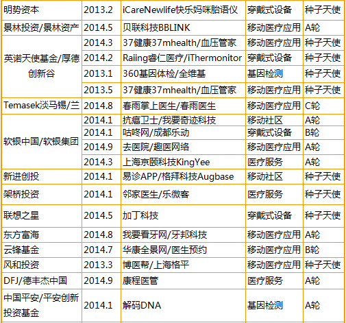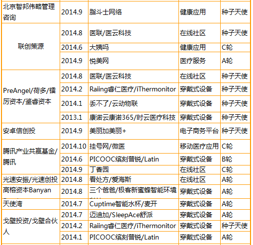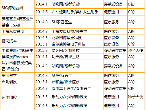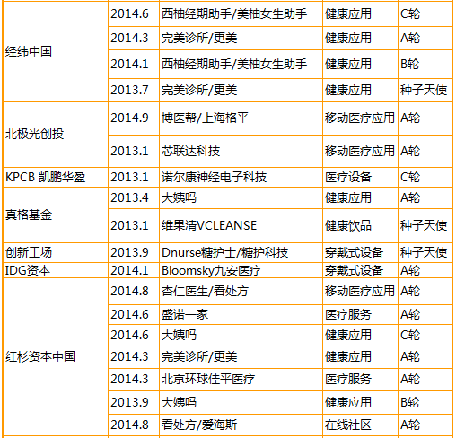 在动脉网互联网医疗研究院的统计数据中,列出了2013-2014YTD参与投资数量在4起以上的投资机构,共计5家,对这些活跃投资机构及投资的互联网医疗案例进行了总结和整理。 互联网医疗领域活跃投资机构: NO1.红杉资本中国基金|SequoiaCapitalChina 主要管理人:沈南鹏、周逵、计越 成立时间:2005 管理资金规模:23.8亿美元+91亿人民币 主要投资领域:科技与传媒、消费品及现代服务业、健康产业、能源与环保 红杉资本陈鹏辉:红杉资本投资,要抓住行业的变化,理解行业的变化,走在行业的前面,并且投资于变化。除了针对不同阶段的投资理念外(早期是创新,成长期是增长,晚期是整合),还要找到变化。 互联网医疗投资案例: 杏仁医生/看处方,一个手机上的医患沟通管理工具,医生与患者通过杏仁号与微信跨平台自由沟通。 盛诺一家,一家主打出国看病全程服务的咨询与服务机构,目前主打赴美就医的癌症评估服务项目。 大姨吗,一款以经期健康为核心关爱女性健康的手机应用。 完美诊所/更美,一款关于整容整形的手机服务APP,2014年8月品牌升级为“更美”。 北京环球佳平医疗,一家专注于为精英阶层和企业集团提供全面的家庭医生系列服务以及整体医疗解决方案的集团公司。 看处方/爱海斯,一个P2P模式的医疗互联网平台,使用独创性方法提供“医疗健康答案“,打造医疗健康决策和医疗健康信息管理平台。 NO2.经纬中国|MatrixPartnersChina 主要管理人:张颖 成立时间:2008 管理资金规模:9亿美元 主要投资领域:互联网、移动互联网、医疗健康、硬件 经纬中国张颖:经纬中国将会更关注技术创新类的公司。 互联网医疗投资案例: 西柚经期助手/美柚女生助手,一个面向女性的经期服务工具。 完美诊所/更美,一款关于整容整形的手机服务APP,2014年8月品牌升级为“更美”。 NO3.软银中国资本|SBCVC 主要管理人:薛村禾 成立时间:2000 管理资金规模:逾20亿美元 主要投资领域:信息技术、清洁技术、医疗健康、其他(消费升级、现代农业等) 软银中国资本华平:医疗领域投资特点就是,围绕医疗器械、医疗服务、生物制药3大方向,寻找细分市场中的领头羊。 互联网投资案例: 抗癌卫士/我要奇迹科技,一家主打癌症领域的垂直移动医疗健康社区和病友互助平台,为癌症患者及其家属搭建分享交流平台。 咕咚网/成都乐动,一个软硬件结合的运动健康服务商,通过咕咚手环、APP等监测用户运动睡眠等,并在云端建立个人健康档案。 去医院/趣医网络,一个移动互联网上的就医咨询与服务平台,支持预约挂号、排班查询、报告查询、手机支付、叫号查询、医院导航等功能。 上海京颐科技KingYee,一家智慧医疗技术及服务提供商,主要业务有:移动医疗、医疗物联网、医院HRP、去医院(掌上医院)4大部分。 NO4.PreAngel 主要管理人:王利杰 成立时间:2011 管理资金规模:逾3000万人民币 主要投资领域:互联网、移动互联网 PreAngel王利杰: PreAngel又名(荷多)选择投资项目一定要有明确的商业模式。 互联网医疗投资案例: 医联/医云科技,一个专注于面向医生群体的移动社交应用,提供医学问答、图说病例、医生圈互动服务等。 Raiing睿仁医疗/iThermonitor,一家无线医疗产品开发商,主要做基于移动互联网的医疗生理参数无线监测解决方案。 丢不了/云动物联,一家为家庭提供安全保护服务的软硬件产品,目前产品包括:丢不了(diubuliao)儿童保护表、老人防丢表、宠物防丢项圈、手机APP。 康诺云康诺365/时云医疗科技,致力于利用大数据进行“未病”预警,通过可穿戴式设备、跟踪用户身体数据、发现用户健康的变化过程。 NO5.英诺天使基金 主要管理人:李竹 成立时间:2012 管理资金规模:逾3亿人民币 主要投资领域:互联网、移动互联网、医疗健康、现代服务、传媒新媒体、金融、硬件 英诺天使基金李竹:用“互联一切、智能一切、娱乐一切”三个短语来描述未来天使投资的主基调,“互联一切”强调O2O和垂直社交网络;“智能一切”包括数字健康及无人系统;而“娱乐一切”则强调娱乐与科技、互联网的结合。 互联网医疗投资案例: 37健康37mhealth/血压管家,一个主打慢性病管理的健康服务平台,目前主打产品为高血压相关的服务,提供移动端监控、管理服务。 Raiing睿仁医疗/iThermonitor,一家无线医疗产品开发商,主要做基于移动互联网的医疗生理参数无线监测解决方案。 360基因体检/全维基,一个面向大众用户的基因体检服务。 以下是2013-2014YTD期间,活跃的投资机构及互联网医疗创业项目: