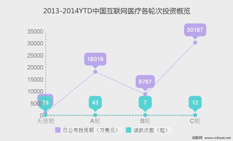 据动脉网互联网医疗研究院投融资数据库统计,2013-2014近两年国内互联网医疗创业投资事件66起,关注互联网医疗领域的投资机构共58家,投资机构活跃次数总计91次,披露融资额5.8亿美元。其中,天使轮活跃次数29次,披露融资额940万美元;A轮发生活跃次数43次,披露融资额18019万美元;B轮活跃次数7次,披露融资额8767万美元;C轮活跃次数12次,披露融资额30167万美元。从数据上看,更多投资事件集中在早期阶段,后B、C轮较少,这是因为中国互联网医疗创业整体处于早期阶段,市场有成熟经验和成功商业模式的企业还尚少。