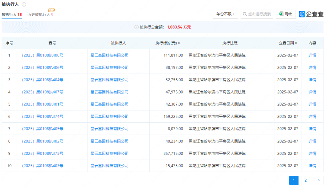 近日,星云基因因短短一天内,连续收到13条被执行通告,引起业内广泛关注,企查查数据显示,2月8日,黑龙江省哈尔滨市平房区人民法院对星云基因科技有限公司连发13条被执行人信息,自今年1月以来,星云基因累计被执行总金额已经达到1083万!