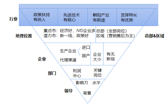 按筛选顺序建议:地理>企业>部门>领导。到达部门层次选择余地已经不多,选领导也需要外部资源,主要放在前三项已经不错。