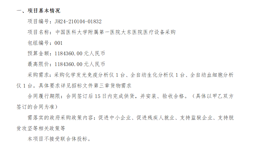 本次投诉正是发生在该医院医用设备采购中:2024年10月31日,这家医院发布招标公告,预算118.4万余元采购一批包含化学发光免疫分析仪、全自动生化分析仪和全自动血细胞分析仪等在内的医疗设备。 然而,采购进程启动后不久,便遭遇了吉安市*浩贸易有限公司质疑、投诉的风波。投诉原因为项目参数限定不合理、具有明显排他性和独家性参数,限制了其他供应商参加此项目的合法权益。请求将所质疑的参数予以删除,重新制定公平的参数组织招标。最终经调查取证,沈阳市大东区财政局认定:投诉事项成立,责令重新开展采购活动。本次招标以失败告终。