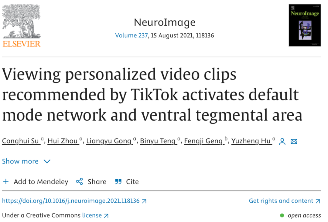 2021年浙江大学发表在NeuroImage上的研究指出,当人们观看“猜我喜欢”的短视频时,大脑DMN亚区和中脑腹侧被盖区活跃度更高,进而强化了观看短视频的行为,让人刷到停不下来,越来越“上头”。