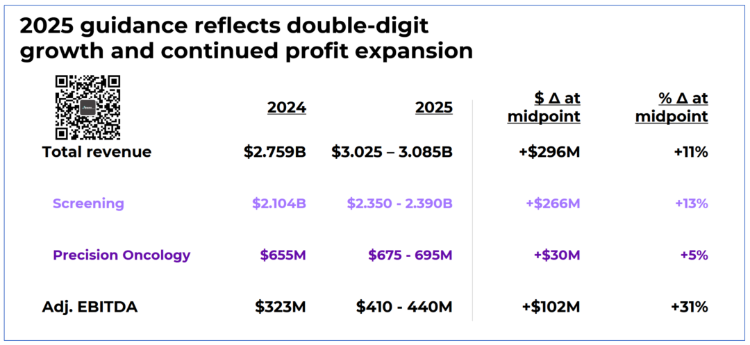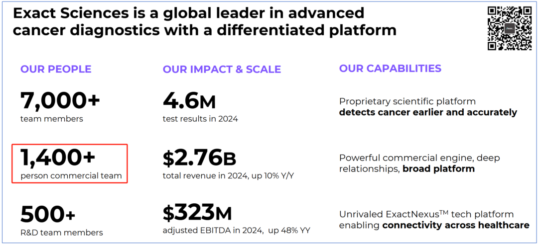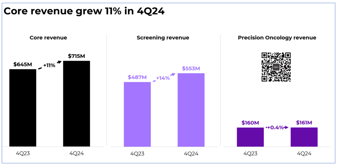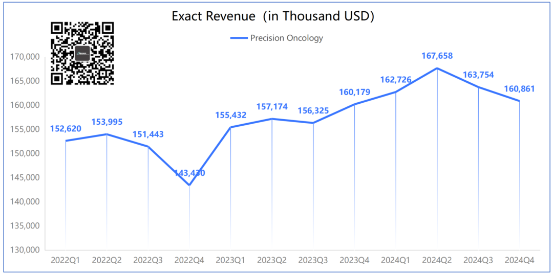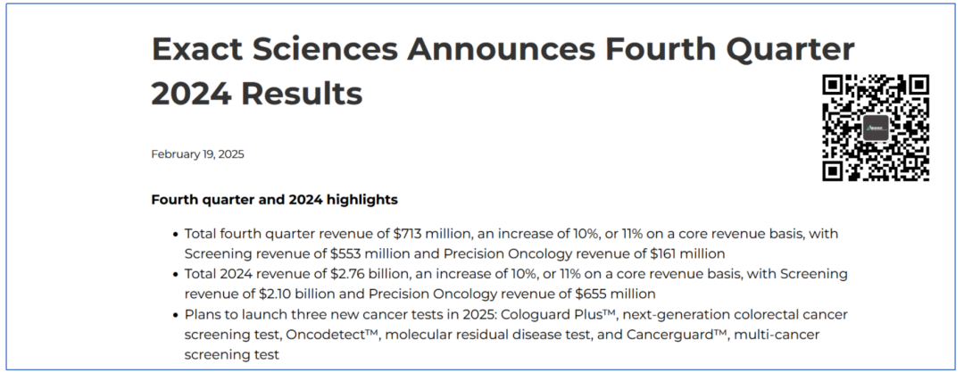 Exact Sciences是目前全球最大的肠癌早筛检测提供商,其Cologuard是目前肠癌早筛产品卖的最好的。 其实除了Cologaurd,他还有oncoguard liver针对肝癌的早筛产品,如果算上Riskguard(遗传性肿瘤风险),那确实不能把他的筛查类业务全部归于肠癌早筛。 而Exact Sciences自身也不愿意把自己困在肠癌早筛这一个领域,2025年,该来的总会来。 #01 一骑绝尘 2025年2月19日,Exact Sciences发布了2024Q4和全年财报。 财报显示,公司2024Q4营收7.13亿美元,同比增长10.3%,环比增长0.7%。 如果大家有印象,前两天咱们分析Guardant的时候提到Guardant全年营收7.39亿美元。 什么叫龙头,这就是。 Exact核心早筛业务本季度营收5.53亿美元,同比增长13.5%,环比增长1.4%。 精准肿瘤业务营收1.61亿美元,同比增长0.4,环比下滑1.8%。 全年来看,Exact交付了460万例癌症检测结果,营收达到27.59亿美元,增长10.4%。 全年调整后EBITDA达到3.23亿美元,增长48%。 自由现金流7500万美元,增长133%。 虽然就是,呃..账面上还是亏损的。 全年录得亏损10.36亿美元,远远高于去年的2.02亿美元。 Why? 根据财报内容“公司在第四季度确实确认了一项8.3亿美元的非现金减值费用,这与2021年1月完成的Thrive收购有关,这项减值费用反映了外部因素的变化,主要是最近MCED法案立法中预期的报销变化。” 呃,近期没关注MCED立法方面的变化,哪位大佬解惑下。 反正调整后2024Q4亏损就只剩下2642.1万美元了,全年亏损也只有1.9亿美元,低于去年的2.04亿美元的亏损。 不过,对于Exact来说,2025确实充满挑战。 #02 挑战2025 挑战一:早筛产品增长率放缓。 毫无疑问,Exact这部分业务虽然在增长,但是环比增长率已经在下滑了。 2023年季度环比增长率均值是4.8%,而到了2024年则只有3.4%了。 对此,管理层认为,这不成立。 他们有两个论据。 第一,2025年再筛查人数增长30%,达到200万; 第二,Cologuard Plus,也就是第二代Cologuard将在2025Q2上市,届时将拉动需求。 好吧,算你厉害。 挑战二:精准肿瘤产品线业绩持续下滑。 2024Q4的营收只有1.61亿美元,连续第二个季度环比下滑。 对此,管理层表示我们将用新产品来解决问题。 第一,2025Q2推出Oncodetect MRD检测。 Tumor-informed路线,WES基线,杂交捕获法定制探针,最多200个点。 第二,MCED产品预计2025年下半年推出LDT版本。 在此前从开的数据中,Cancerguard总体特异性达到98.5%,敏感性50.9%。 不知道为啥MCED也被算到了精准肿瘤产品线里。 好吧好吧,你都有理。 不过,Exact的2025财务指引算是比较谨慎乐观了。 其中,预计2025年营收30.25-30.85亿美元,相较于2024年中值增长11%。 两位数,也不是不行。 只是跟Guardant和Natera一比总是觉得更保守了点。 想想,三者体量差距有点大,大概参考下得了。 #03 最后 最近Exact应该是再次增加了人手,其商业化团队(可以理解为销售相关)增加到1400+。 前一次的表述是1400,也就是再加了几个吧。 如何管理这么庞大的团队、激发他们的战斗能力也是不小的挑战。 Exact需要让自己继续保持强大的战斗力,身后的跟随者可是越来越多了。 Geneoscopy、Mainz BioMed、Guardant Health、Natera都在切入肠癌早筛市场,而这1400个人也是现成的、培训好的人才库嘛。 Exact Health的Cologuard Plus是一个反击,血液版Cologuard也是一个反击。 哦,对了,血液版Cologuard数据应该在2025年中期解密。 目前这个产品还没名...要说相较于Guardant Health的Shield有什么优势还为时尚早。 不过,等Guardant培训好他们的销售,是不是也可以挖过来用用? END 所有内容均不作为投资建议,信息均来自公开资料。 |