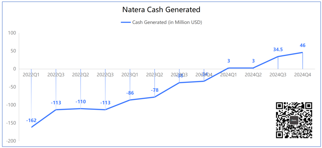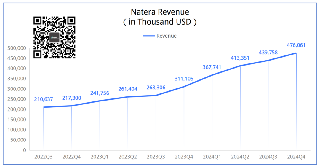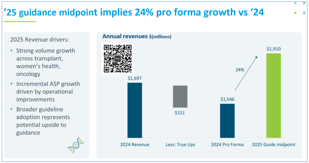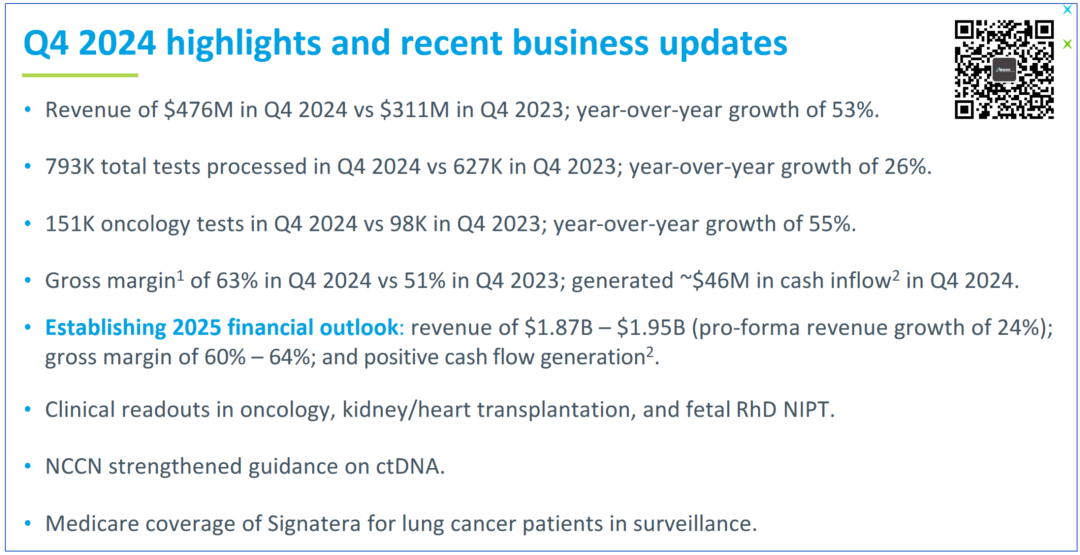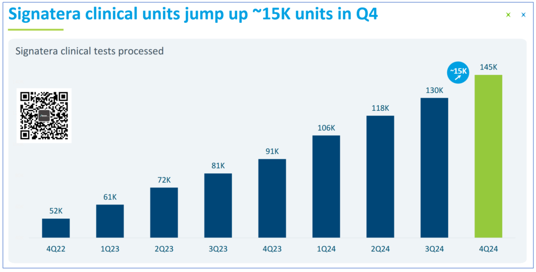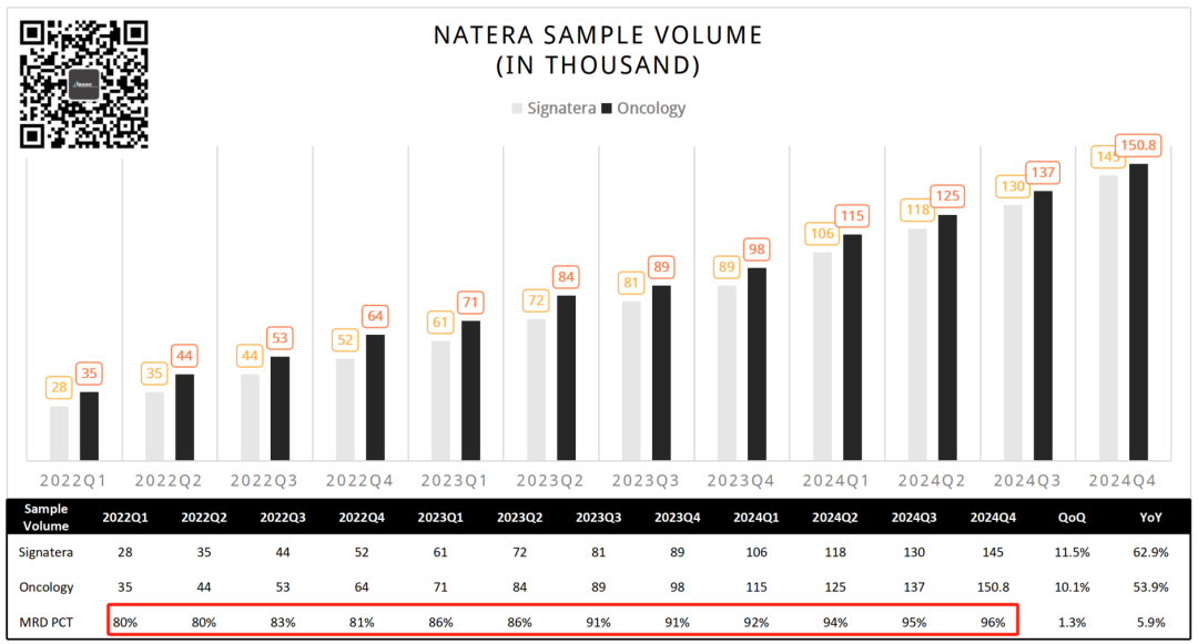 相信我,标题你没看错。 (PS:有朋友建议给这些美国公司取个昵称,比如Natera就叫“拿他辣”怎么样?) Natera是美国肿瘤微小残留病灶(minimal residual disease, MRD)检测领域的龙头,当然,这不是说别的做的不行。 只是在这一领域,这货做的也太大了。 咱们今天就试着解读下这份2024Q4财报,顺便涨涨知识。 省流小细节: 第一,tumor-naive版Signatera(MRD)将在2025年中期上市; 第二,Tumor informed 版Signatera基于WGS基线产品的个性化定制位点从16个扩展到64个; 第三,肠癌早筛公开的数据秒杀Guardant Health的Shield性能; 第四,Signatera目前平均价格1100美元(不知道Natera的定价是指单次还是6次); #01 震撼一整页 2025年2月27日,Natera发布财报。 财报对应的ppt第一页的总结部分就亮瞎了我的眼睛。 这张总结有3个主要部分:财务状况、样本状况和未来展望。 其中,财务方面: 2024Q4营收4.76亿美元,同比增长53%,环比增长8%。 毛利率63%,远远高于2023同期的51%。 2024Q4现金流继续正向,达到4600万美元。 整个2024年都维持了正向现金流,并且呈现扩张趋势。 样本方面: 2024Q4完成检测量79.3万例,相较于去年同期增长26%。 肿瘤检测业务15.1万例,相较于去年增长55%。 NCCN指南纳入MRD,Medicare医保覆盖Natera家的肺癌MRD监测。 2025预期: 全年营收18.7亿-19.5亿美元,毛利率60%-64%(2024年60.3%),全年继续正向现金流。 这一页PPT,都是羡慕不来的无奈。 然而,这还不是Natera牛X的全部。 #02 MRD制霸 一张图说下Natera的MRD检测有多么恐怖。 2024Q4 Natera的MRD检测量达到惊人的14.5万例,同比增长62.9%,环比增长11.5%。 全年MRD检测量突破49.9万例,相较于去年的30.3万例增长64.7%。 按照一年365天不间断收样,平均每天要处理超过1300例样品。 这可能是某些实验室一个季度的量,甚至半年的量,还是全部的检测... 其肿瘤检测样品中MRD占比持续提高,目前已经达到惊人的96%。 收手吧阿祖... 然而,可怕的是Natera并不打算就此收手。 (这张图其实有个彩蛋,在财报会上有提及,我们最后说) 我们前段时间刚讲过,Natera也出Tumor-naive路线的MRD产品啦(2025年中期)... 此前Natera的MRD产品全部是基于Tumor-informed路线,这下通过结合甲基化检测技术达成了MRD检测的全制霸。 走Guardant的路,让Guardant无路可走。 预计,在纳入NCCN指南后MRD产品在2025年仍将保持较高增长速度。 根据财报会上管理层的表述,MRD产品的ASP(平均销售价格)在2024Q4大约为1100美元,相较于2023Q4的1000美元又有提高。 不是,人家美国这检测企业都怎么玩的? 算了,放这张图出出气吧。 #03 未来 2025年Natera的营收预计能达到18.7亿-19.5亿美元。 这看起来相较于2024年16.97亿美元营收增长并不大,大概在10%-15%左右的增幅。 但是Natera认为,2024年营收中有1.51亿美元是现金收入与确认收入的差值(True Ups)造成的。 也就是说,从财务上看,2024年总的营收应该为15.46亿美元。 照此计算,2025年营收预期中值大概比2024年增长24%。 行吧,你说啥就是啥吧。 其实对于Natera未来还有个大事:肠癌早筛。 根据目前拿到的数据,AA(高级别腺瘤)的灵敏度18%,特异性91%。 CRC的灵敏度91%,特异性91%。 虽不及Cologuard,但是秒杀Guardant Health的Shield却是刚刚好。 而且,用的是血液样品。 嘿嘿...就问Guardant慌不慌。 在回答分析师提问时,Natera表示临床数据预计2026年底收集完成,2027年有望获得FDA批准。 目前也在评估添加其他癌种的可行性,将产品进一步扩展到多癌早筛。 最后Signatera的一些小细节: 在Tumor-infomed路线的Signatera中(WES基线),监测时用的覆盖度是100,000X(10万X),16个位点。 如果使用WGS基线,那么定制位点会扩大到64个。 测序正在转向Illumina NovaSeq X。 随着更多覆盖政策的实施,特别是在制药公司和学术界的应用,Signatera的ASP有望在未来几年翻倍。 这...人家这才叫生意... END |