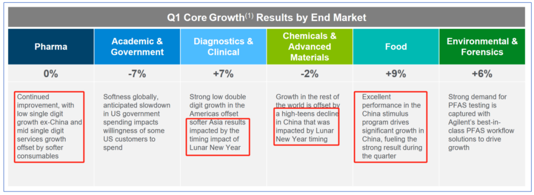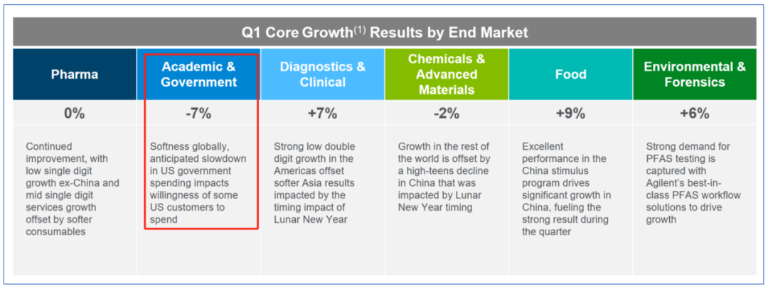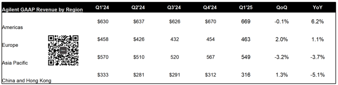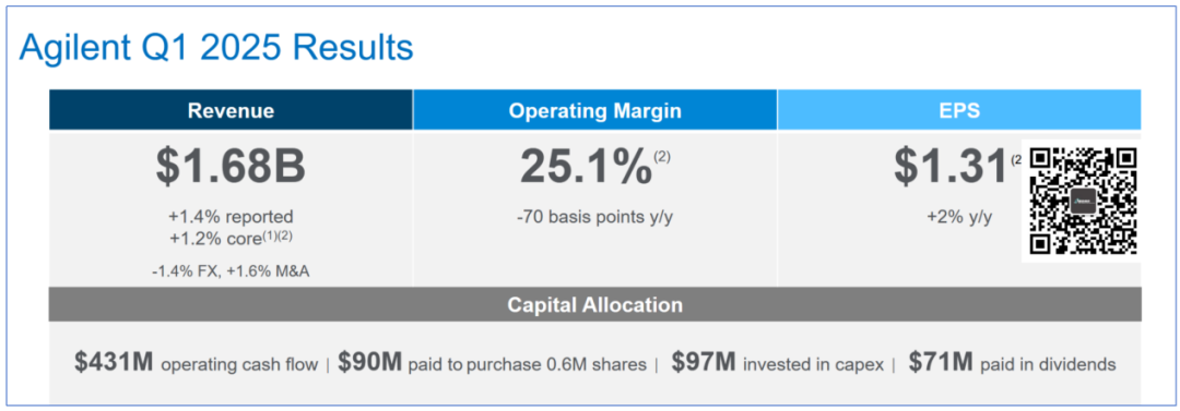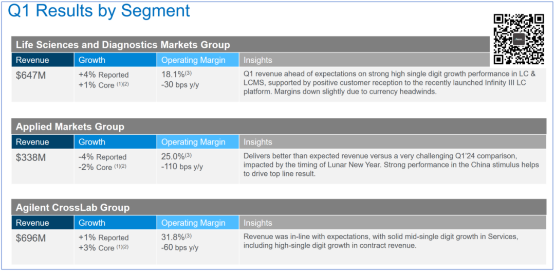 上个季度,安捷伦的事业群刚好进行了重组,所以,我们好像省事了... 那么,作为重组之后的第一个季度安捷伦各个事业群表现如何呢?中国区的刺激政策又带来了什么?未来预期有变化吗? #01 开端 2025Q1安捷伦营收16.8亿美元,同比增长1.4%,高出分析师普遍预计的16.6亿美元。 但是相较于2024Q4的17.01亿美元,略微下滑1.2%。 EPS 1.31美元(2024Q4:1.46),同比增长2%,同样高出了分析师普遍估计的1.27美元。 营业利润率25.1%(2024Q4:27.4%),相较于去年同期下滑了70个基点。 各个板块来看,新LDG(Life Sciences and Diagnostics Markets,生命诊断事业群)营收6.47亿美元,同比增长4%。 营业利润率18.1%,同比下滑30个基点。 Agilent认为,这部分增长主要来自于液相/液质联用的良好表现。 AMG(Applied Market Group,应用市场事业群)营收3.38亿美元,同比下滑4%。 营业利润率25.0%,同比下滑110个基点。 这也是Mike Zhang执掌AMG的第一个季度,Agilent认为主要是因为中国新年的影响。 毕竟今年过年早,影响了采购计划的执行。 ACG(Agilent CrossLab Group,交叉实验室事业群)营收6.96亿美元,同比增长1%。 营业利润率31.8%,下滑60个基点。 等等,你问我为啥没有环比? 呃。。。这3个事业群刚重组过,有些财务调整不确认归于哪里,只能以官方为准。 实在要看,也不是不行...就上图这个德行了。 反正,总体来看Agilent这个季度表现基本就两个字概括:一般。 #02 刺激China 每次安捷伦的财报对中国确实很重视,这次财报会上提了China有35次(包括ex-China)。 但是表述方面非常有意思。 我列举下: 制药市场:收入持平,中国以外地区低个位数增长,中国高个位数下降。 化学与先进材料市场:收入下降2%,中国以外地区增长,中国高个位数下降。 诊断与临床市场:收入增长7%,美洲和欧洲表现强劲,亚洲区受农历新年表现疲软。 但是,安捷伦也说了食品市场收入增长9%,主要得益于在中国国家刺激计划中的出色表现。 这说明我们要进军食品市场(划掉) 这说明中国的刺激政策是在起效的,但是某些行业的复苏还在进行中。 财报会上,Mike Zhang 提到了中国刺激订单的强劲表现,主要在食品和化学材料领域呈现增长。 那么其他领域是不是不行呢?也不是。 比如LDG老大Simon May说: In China, our accelerating share gains were apparent in recording a win rate of more than 50% on stimulus-related tenders. With our long history in the region elevated by our local manufacturing capabilities, we are well positioned to expand our market leadership in China. 在中国,我们加速提升市场份额,在与刺激计划相关的招标中,我们的中标率超过了50%。 金额约为3500万美元,只是不知道这个50%的数字是否准确。 反正...拔群啊。 从历史数值来看,最近4个季度中国区确实是在上升的。 但是,是否可能有更多的刺激计划并不确定,后续表现还是尚待观察确认。 #03 未来-不确定 财报发布后,Agilent安捷伦的股价跳水4.97%。 一个很大的可能是Agilent安捷伦对2025财年的谨慎态度造成的。 实际上,比较2024Q4的表述,本次对2025财年指引的调整幅度可以说几乎可以忽略。 安捷伦只把全年净营收从67.9亿美元-68.7亿美元下调到66.8亿美元-67.6亿美元,也就1.1亿美元而已。 甚至,EPS都没变。 关键是对未来,安捷伦变得更谨慎了。 Why? 第一,美国政府投入不确定。 在回答分析师提问时,高管们表示学术和政府市场在1月有所放缓,但影响较小。细胞分析工具在学术和政府市场有较高敞口,但总体影响有限。 2025Q1,学术与政府市场收入占比约为8%。 而最近的风,特别是NIH的大动荡下,还是有点压力的。 第二,中国刺激政策未来的走向并不确定,不再赘述。 第三,宏观经济环境的改善存在不确定性。 这比较好理解,特别是生物医药能否复苏并不确定。 #04 最后 还会裁员吗? 在回答分析师提问时,管理层表示“公司正在简化管理层结构,提高决策效率,预计下半年会有成本节约”。 这一表态很耐人寻味啊... END