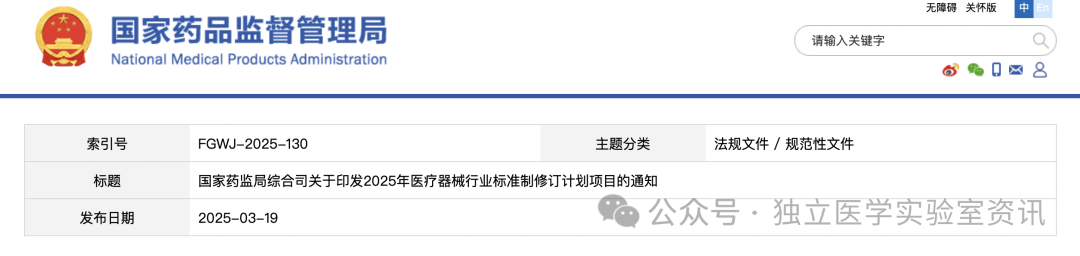 国家药监局综合司关于印发2025年医疗器械行业标准制修订计划项目的通知