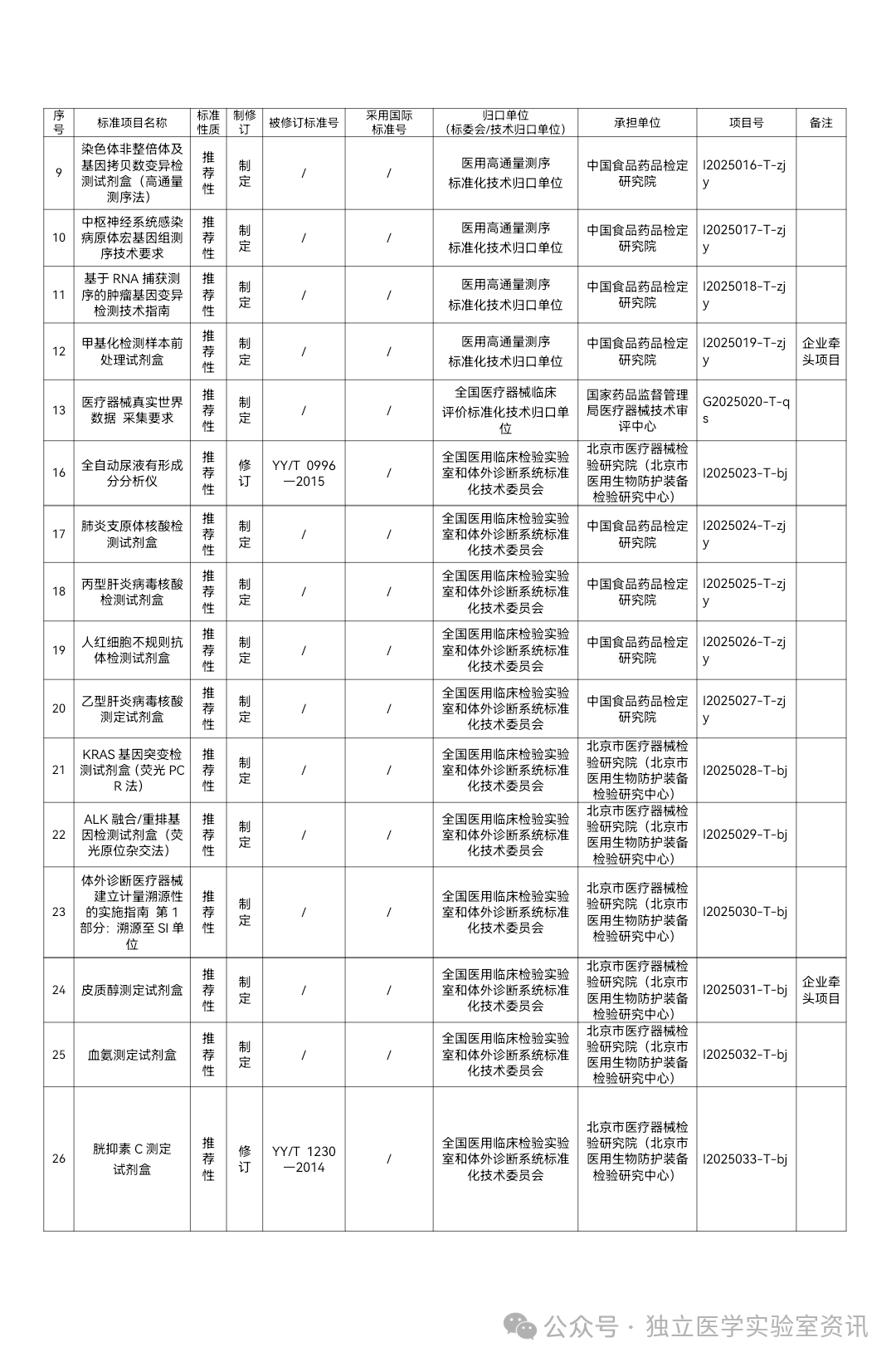 其中2025年医疗器械推荐性行业标准制修订计划项目,涉及NGS等体外诊断项目,部分推荐性标准制定,为企业牵头项目。