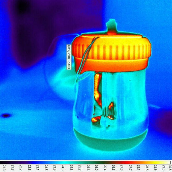 研究人员对NINA进行的热成像,用于评估热量流失,就保温材料的效果进行对比。 研发性能高而廉价的材料 研究人员在开发过程中确保孵育器内各个部件的性能最大化,保证为小试管中进行的扩增反应提供恒定温度。为实现这点,研究团队研发了一个储存并调节化学反应产生的热量的特殊部件,该部件可以轻松地安装在试管支架上,从而保证在每个试管表面均匀加热。在设计装置主体部分的时候,研究团队使用了热成像相机对廉价材料的性能进行了评估,并最终选择了可重复使用的热水瓶来最大限度减少装置的热量流失。 研究中另一个关键点就是该装置中的孵育器必须运转起来。精细诊断试验室里的仪器在室温和人工控制的条件下运行,而这个装置则必须可以在极端环境温度下进行操作。孵育器内部的反应必须在一个小时内维持在60摄氏度。因此研究组对NINA孵育器在不同环境温度范围内正常工作的性能进行了检验。该设备可以在外部环境温度在10摄氏度至32摄氏度之间时均保持在内部温度60摄氏度。 研究组展示了他们的扩增系统可在短短80分钟内提供敏感而可复现的HIV-1检测服务。他们现在正在为该扩增系统配备简易现场血样核苷酸提取技术。拉巴里说:“为完成这一低资源配置的诊断技术,接下来需要做的是在扩增之前将患者血样的简易核苷酸分离方法整合进来。当前的方法既昂贵又存在技术难点。幸运的是我们正在测试的方法中有几个看起来很有希望成功。”