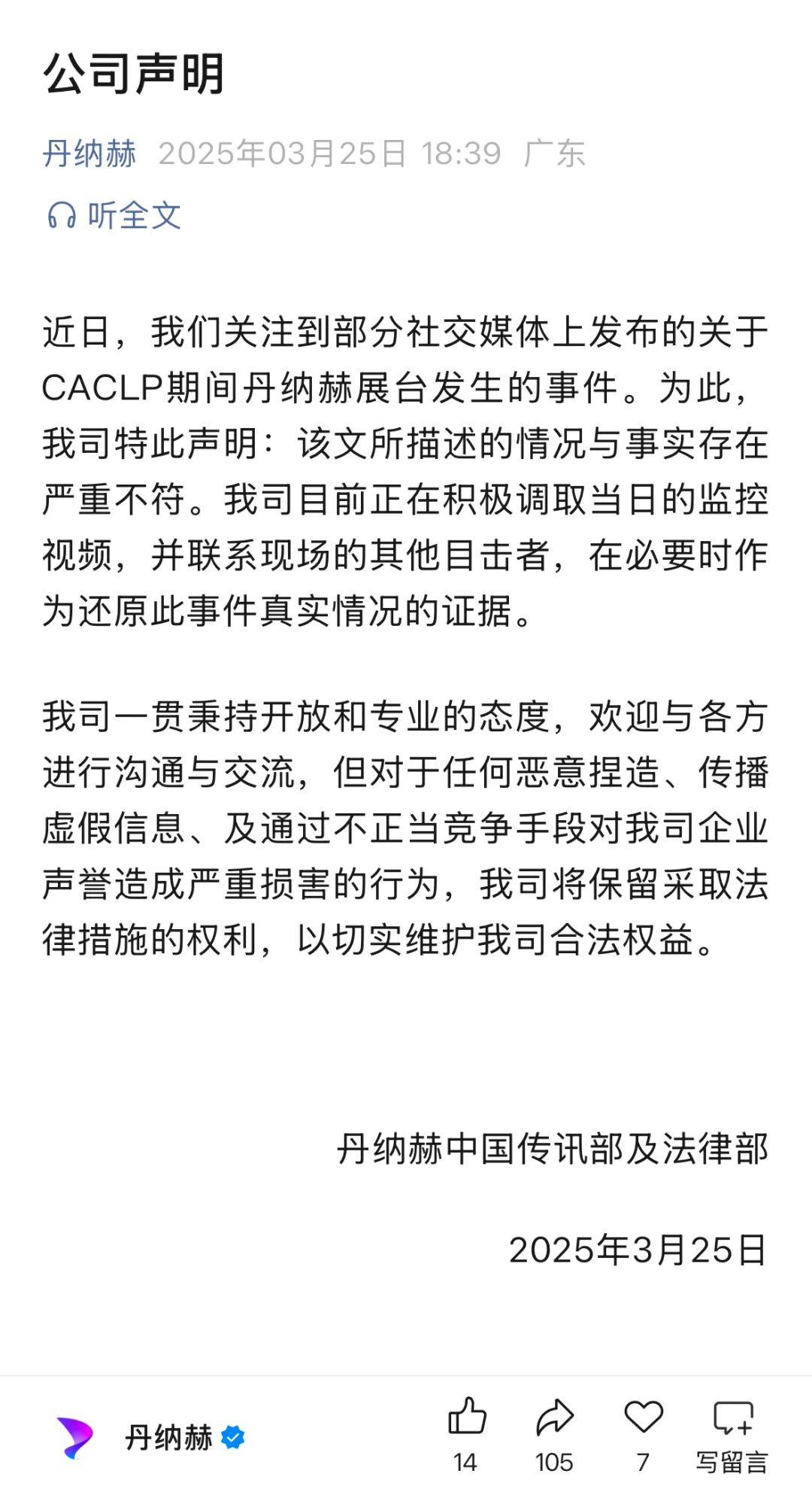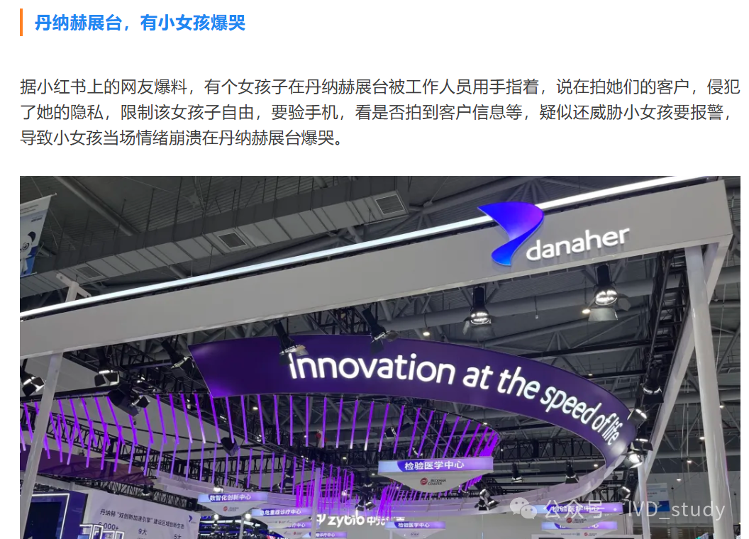 近日,我们关注到部分社交媒体上发布的关于CACLP期间丹纳赫展台发生的事件。为此,我司特此声明:该文所描述的情况与事实存在严重不符。我司目前正在积极调取当日的监控视频,并联系现场的其他目击者,在必要时作为还原此事件真实情况的证据。 我司一贯秉持开放和专业的态度,欢迎与各方进行沟通与交流,但对于任何恶意捏造、传播虚假信息、及通过不正当竞争手段对我司企业声誉造成严重损害的行为,我司将保留采取法律措施的权利,以切实维护我司合法权益。起因是CACLP展会期间,据其他媒体发布的当事人现场描述,有个女孩子在丹纳赫展台被工作人员用手指着,说在拍她们的客户,侵犯了她的隐私,限制该女孩子自由并要验手机,看是否拍到客户信息等,疑似还威胁女孩要报警,导至女孩当场情绪崩溃在丹纳赫展台爆哭。该爆料也发布了手机相册截图。该笔记目前仍可以看到,不过也表示收到了丹纳赫的投诉。根据此次丹纳赫的声明,事情也许还有反转,具体情况有待丹纳赫公布调查结果。