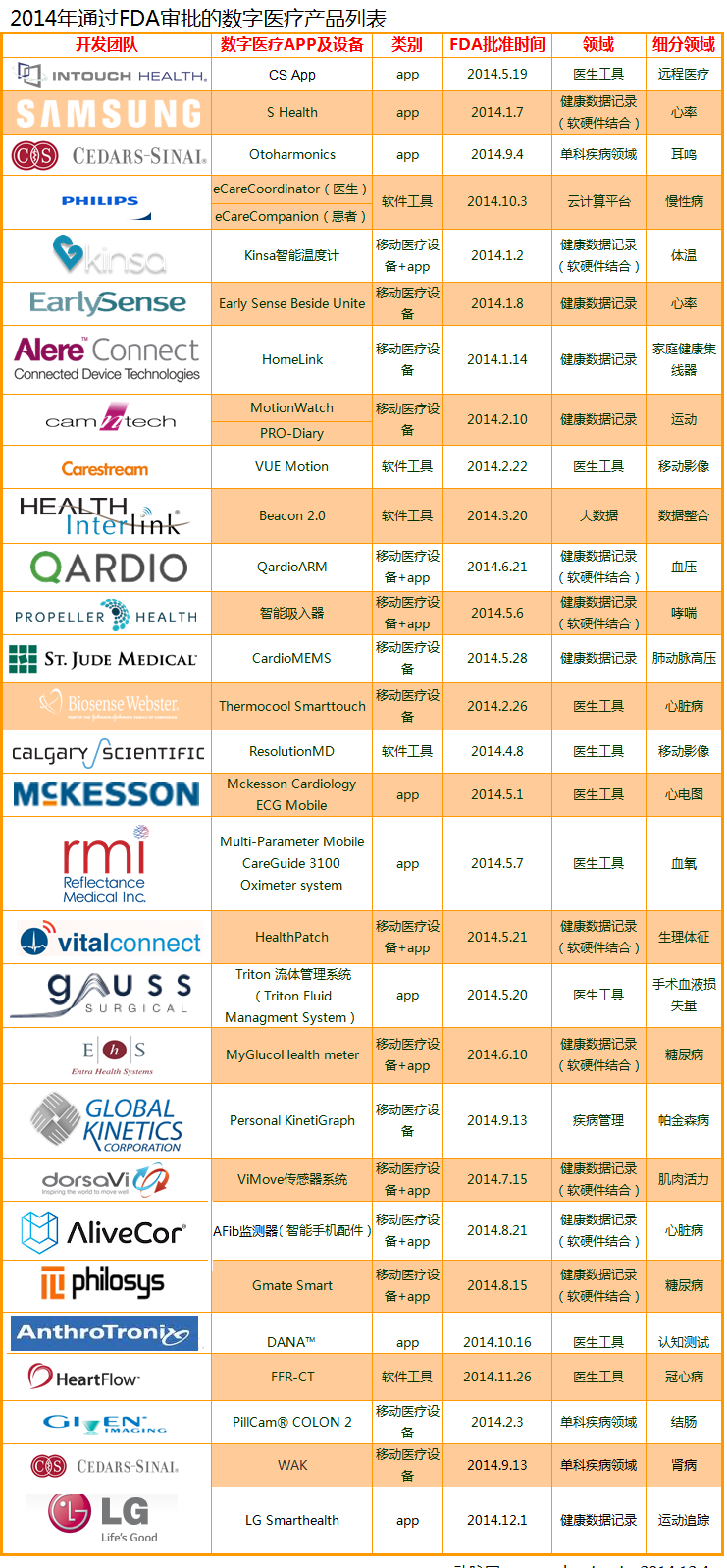 为了避免移动医疗应用缺乏监管而存在的潜在风险造成伤害,美国食品药品监督管理局(FoodandDrugAdministration;FDA)也已于2013年9月正式公告移动医疗应用(MobileMedicalApplicationFinalGuidance)指导的最终版本,移动医疗在发展上也开始有初步的依循规范,更有助于移动医疗的发展。 如同监管受MDDS(MedicalDeviceDataSystem)规范的医疗设备一样,FDA监管移动医疗应用的原则,也是划分成3个类别,划分方式是移动医疗应用的功能(functionality)若没有正常运作时,造成病人安全风险的程度差异而定。 AliveCor的总监MichaelRighter曾说,FDA实质上要求的就是类似软件监管,一般好的软件工程师会自然地做这些事情,像代码审查、单元测试、系统级测试、变更监控等,这些方法通常需要有经验的开发人员在软件部署上严密操作。 FDA数字健康产品审批简明指导 依照FDA的认定,需要被监管的移动医疗应用种类有3类,I类医疗设备是可以连结并控制一个或多个医疗设备,或是显示、储存、分析、传送特定病人的医疗设备资讯,如远端显示病人床边监测器监测的资料、显示脑波图、控制血压计袖带充气和放气等。该类部分应用进入市场前可能只需一份510(k)申请,售前通知(premarketnotification),与其他类App相比手续简单。 II类医疗设备是可以藉由配件、显示器、传感器或是现行已受法规规范的医学设备具备的功能,让移动装置可以转变成受法规规范的移动医疗装置,如将移动装置接上血糖试纸,再使用装置上的App检验血糖,让该移动装置成为血糖计。几乎所有这类医疗设备都需自动提交510(k)申请,并进行售前通知。 III类医疗设备是可以执行特定病人的分析、提供特定病人的诊断或治疗建议,这种用以分析医学设备资料的独立式运作软体(Stand-alonesoftware),FDA认为它是医学设备的附属品,所以它所受监管的分类会相同于搜集各种资料中最高风险设备的分类。该类医疗设备必须获得FDA的售前批准(premarketapproval)。且这期间需要临床试验,产品不同需要的时间也不等,几年甚至更长,而且费用高昂。 申请III类的GlobalKinetics公司开发的移动医疗设备PersonalKinetiGraph,可监测和治疗帕金森病,针对帕金森患者的活动提供全面的自动化报告,使神经科医生和其他医生可以更容易地识别运动症状的变化,帮助决策以优化治疗。 三类医疗设备的差别是?以绷带举例,普通绷带仅仅是覆盖伤口无其他作用,则归属Ⅰ类;与手机连接,能够通过应用查看伤口温度,且不小心还可能伤口感染,对会诊会有轻度风险,归属Ⅱ类;连接手机后,不只能显示伤口相关信息,还能通过药物算法给予患者反馈、指导等,归为Ⅲ类。 确定你的产品后,然后结合合适的监管路径和商业模式.如果你的模式是收费,那么你就可能会需要发表临床结果及获得FDA批准。 以下是动脉网就FDA对移动医疗(智能手机连接的医疗设备和独立应用程序(App))的审批情况做的数据整理。2014年度,迄今为止,FDA已批准了31个数字健康产品。 FDA审批通过的移动医疗项目集中在4个类别 今年通过FDA510(k)审核的移动医疗项目类别主要有app、软件工具、移动医疗设备、移动医疗设备+app四个类别,除了软件工具稍少以外,其余类别不相上下,软件工具的项目细分领域主要是医生工具——移动影像业。 医生工具领域通过FDA审批的项目最多 从动脉网互联网医疗研究院今年统计的FDA审批通过的移动医疗项目数据中,主要由有7个细分领域。其中,涉及健康数据记录(软硬件结合)的有9项;未结合其他医疗产品的健康数据记录的有5项;医生工具的有9项;单科疾病领域的有3项;其余大数据、疾病管理、云计算平台各占1项。 2014迄今为止,FDA项目批准的时间走势,从项目领域看到,5月份项目就只有两个领域,医生工具和健康数据记录,看来,FDA对这两个相对低风险的领域,“枪口稍抬高一寸”。 FDA审核项目热点细分领域 在今年的审批项目中,动脉网互联网医疗研究院统计了专注度较高的用途,主要有糖尿病、心脏病、运动追踪、移动影像,涉及心脏的项目最多,其中包括测心率的移动医疗设备,用作治疗及影像诊断的医生工具,用于患者使用的心脏监测器。 哪些开发方正在乐衷于申请FDA? 2014年数字医疗产品获批FDA的开发方情况体现了以下几个趋势: 1、成立时间不超过10年的新创公司占比最多,共有16家。这也说明,互联网医疗创业公司正在加紧突破监管壁垒。 2、部分老牌医疗设备公司,正在进行努力做到突破和创新。例如Philips搭建的云计算平台eCareCompanion、McKesson开发的心电图监测app。 3、一些功能上与医疗严肃诊疗关联度较远,风险度非常小,更倾向于健身运动领域的产品也申请获批FDA。比如就在几日前,LG产品移动健康应用LGSmarthealth获得美国FDA许可,用于追踪活动、热量等,事实上不需要FDA的许可,因为这些并没有涉及到诊断、治疗和预防任何疾病的目的。业内猜测,或许LG对此产品还有深入布局医疗领域的计划。 4、相比患者DIY行为,医生使用的移动医疗工具与诊疗往往密切相关,其安全性风险指数也较高,因而成为申请FDA的重点领域之一。(生物谷Bioon.com) 附:2014-YTD通过FDA审批的移动医疗项目汇总