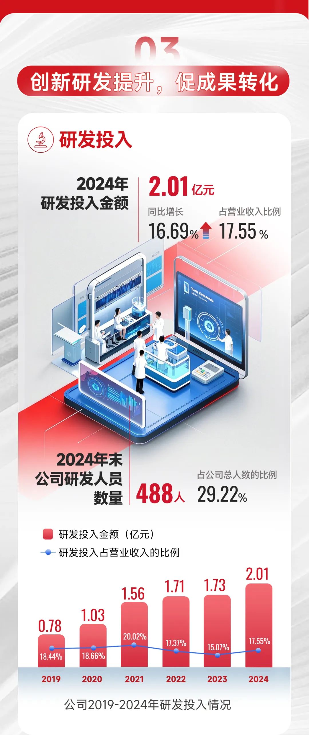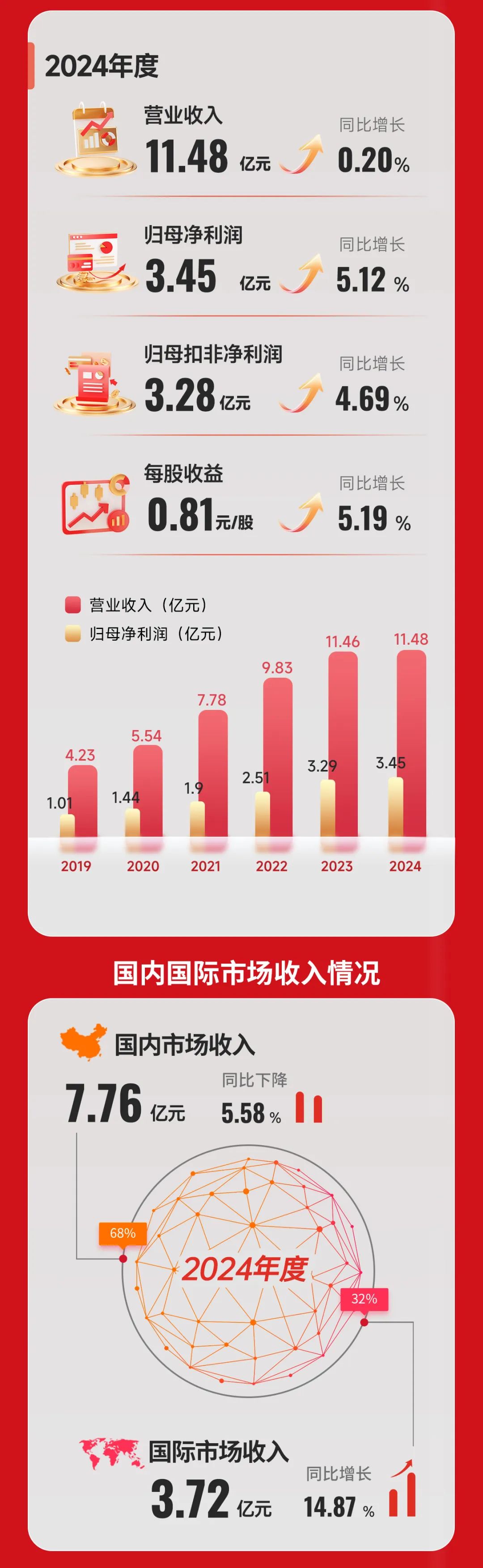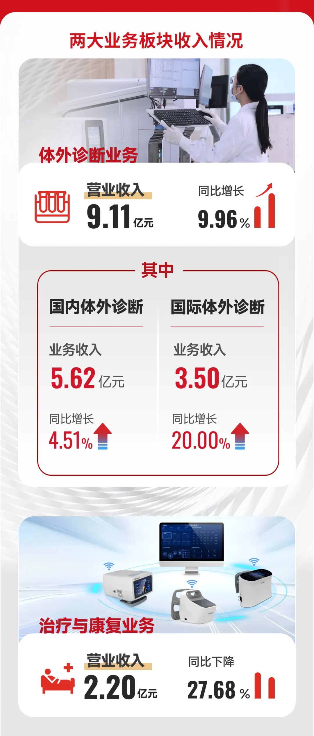 2024年度,公司体外诊断业务营业收入为9.11亿,同比增长9.96%,占总营业收入的79.35%。其中国内收入5.62亿,同比增长4.51%,国际收入3.50亿,同比增长20%。