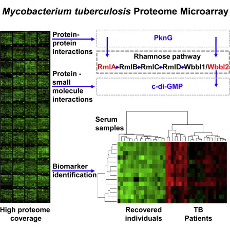 结核病是古老又新发的传染病,死亡人数为各类传染病之首。结核病的防控目前面临三大难题:一是疫苗使用近百年,保护率和保护期受到质疑;二是现有的药物使用历史超过半世纪,耐药性日趋严重;三是诊断缺乏标识物,检出率低。 2014年12月11日,中科院生物物理所、武汉病毒所和上海交大、广东省结核病防治中心、广东体必康公司等机构的学者和临床专家近日在Cell Reports杂志上在线发表了题为“Mycobacterium tuberculosis Proteome Microarrayfor Global Studies of Protein Functionand Immunogenicity”的研究成果。 该蛋白质组芯含4262个结核分枝杆菌基因组阅读框架编码产物,覆盖其基因组编码蛋白质的95%,可用于全局性蛋白-蛋白相互作用分析,以研究人免疫细胞-结核杆菌的互作机制;小分子与蛋白相互作用分析,以进行药物靶标的全局性发现;高通量血清分析,以系统性地进行结核病诊断生物标识物的发现。本文基于该芯片分析了蛋白激酶PknG及小分子C-di-GMP的相互作用蛋白,发现结核杆菌的鼠李糖通路可能会受到以上两个分子的同步调控,并且还利用芯片发现了14个可以区分结核病人和治愈者的标识蛋白。结核分枝杆菌蛋白质组芯片为结核病研究打开新的窗口,可以系统性发现新的免疫原和新的标志物,从而发展新型高效疫苗、新药和检测技术,是结核病基础研究强有力的新方法学平台。