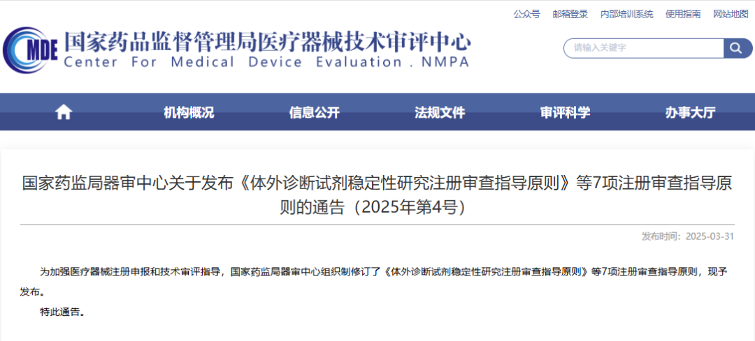 2025年3月底,国家药监局器审中心组织制修订了《体外诊断试剂稳定性研究注册审查指导原则》等7项注册审查指导原则。