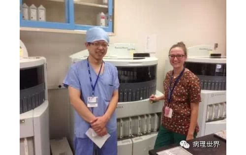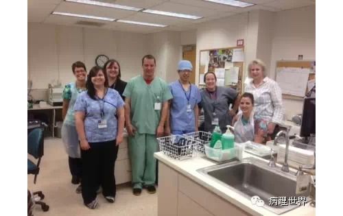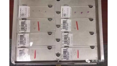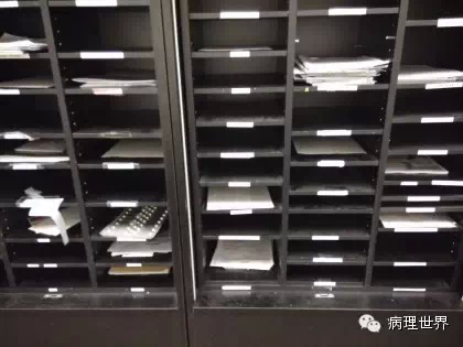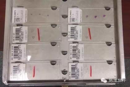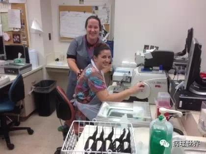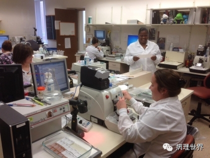 病理技术是病理科的非常关键的组成部分。切片质量直接影响到病理诊断的效率。在Magee-Women Hospital进修期间,我去技术室(常规制片和免疫组化)体验了两天的技术员的工作,有了一定的感性认识。参观技术室首先要做好心理准备。因为技术员的工作是从凌晨4点开始的。因为CAP认证对于诊断时间(turnaround time, TAT)的要求比较严格,大约90%以上的病例第一天取材,第二天早上陆续切片就做好了,当天报告就可以签发。 4:30am的医院景色 4:30我到科里,包埋工作已经开始了,一天大概有800左右的蜡块,三台包埋机,首先是粗针穿刺标本、活检标本;再是大标本、胎盘。每种标本都有不同颜色的包埋盒,方便分类。因为是打号机打的,每一个都先扫描条码,显示具体标本类型、块数。穿刺组织放在蜡中会用一个小金属块(外形类似砝码,下面的形状是不同大小的长方形)压一下,同时放在滴蜡出口旁的小冰台上迅速放一下,最下面的蜡就凝住了,组织也就被固定住了。大的组织也可以用大的金属块压,也有用手指压的(没手套),手指再习惯性地冰上撮一下,蜡就掉了。有些长条形的管状的标本要竖着包埋,取材时不需要切,包埋盒上画个记号(⊙),包埋时再切成几段,包埋面就十分清楚了。刮宫标本都是用小口袋装的,用擦镜纸样的纸制成的,取材时连组织带水倒进去,大小刚好与包埋盒一样,也不会出现交叉污染。标本脱水完、纸一揭就是平平的完整的一块组织或是少一些的,用钝刀片刮下来,非常方便。 包埋进行过程中,切片就开始了。过程差不多,每一台切片机配一台电脑、一台标签打印机,扫一下条码,标签就打印了,穿刺标本往往要打印10多张标签。小标本要求有3个切面,穿刺标本小,每个切面相隔20μm,完整的5张一条共3条漂在水里。3张载玻片是一头是白色的,是普通的HE染色用的,每一条的第一张捞起。余下的4*3,12片用红色头的载玻片(用来做免疫用的)捞起自然晾干,如果需要可以用来做免疫。如果不需要,就扔掉了。活检标本的3个切面间隔是40μm都是严格操作的。另外有些不同的是蜡块不是直接放在冷冻台上的,而是用一个玻璃盆放点水,放在冷冻台上,再把蜡块放在冰水里,他们说这样表面有点水气容易切,特别是小标本。同样的玻璃盆也用在漂片的时候,会不会水温均恒些就没有问了。 免疫组化也是4点多就开始了,同样切片、打印标签。有7台自动染色机,Roche的6台、1台Leica Bond。4台新的Roche可以30张切片随时放入和拿出,这样会效率提高很多。Magee有大约60多种标记。如果没有的标记,切好片直接就送到UPMC其它医院去了。阳性对照组织会预先切好,放在标签一头。根据不同的标记有不同的对照组织。每一张免疫都有阳性对照,在其它医院做的就会有两张切片,一张是需要的、一张是阳性对照片。每一个蜡块还有两张阴性对照。 制片的时效性。从早晨8点开始,就源源不断地把当天的切片分给每一个病理医生,诊断工作就可以开始了。一般小标本会最早出来,特别是乳腺的穿刺标本,可以及时的开出免疫组化。11点之前定出的,当天下午就可以出片。11点之后的第二天出片。 工作量。13个技术员,每年的病理量是32000,HE切片有近22万。免疫组化30000多。每天切片大约1000张左右。 每张IHC切片的红线左边是阳性对照组织。中间两张是阴性对照。 切片室,切片机上面是打印标签的打印机 免疫组化室 Roche免疫组化机器 技术员 每日工作量清单 技术员会分批把制好的切片放在第一个医生的小格子里。 来源:病理世界 |