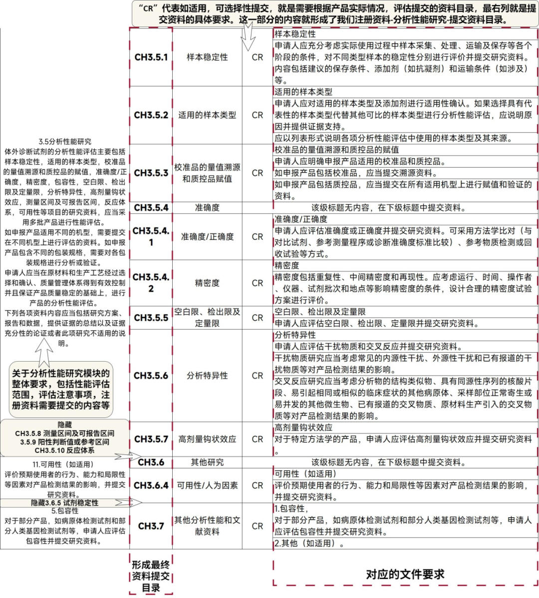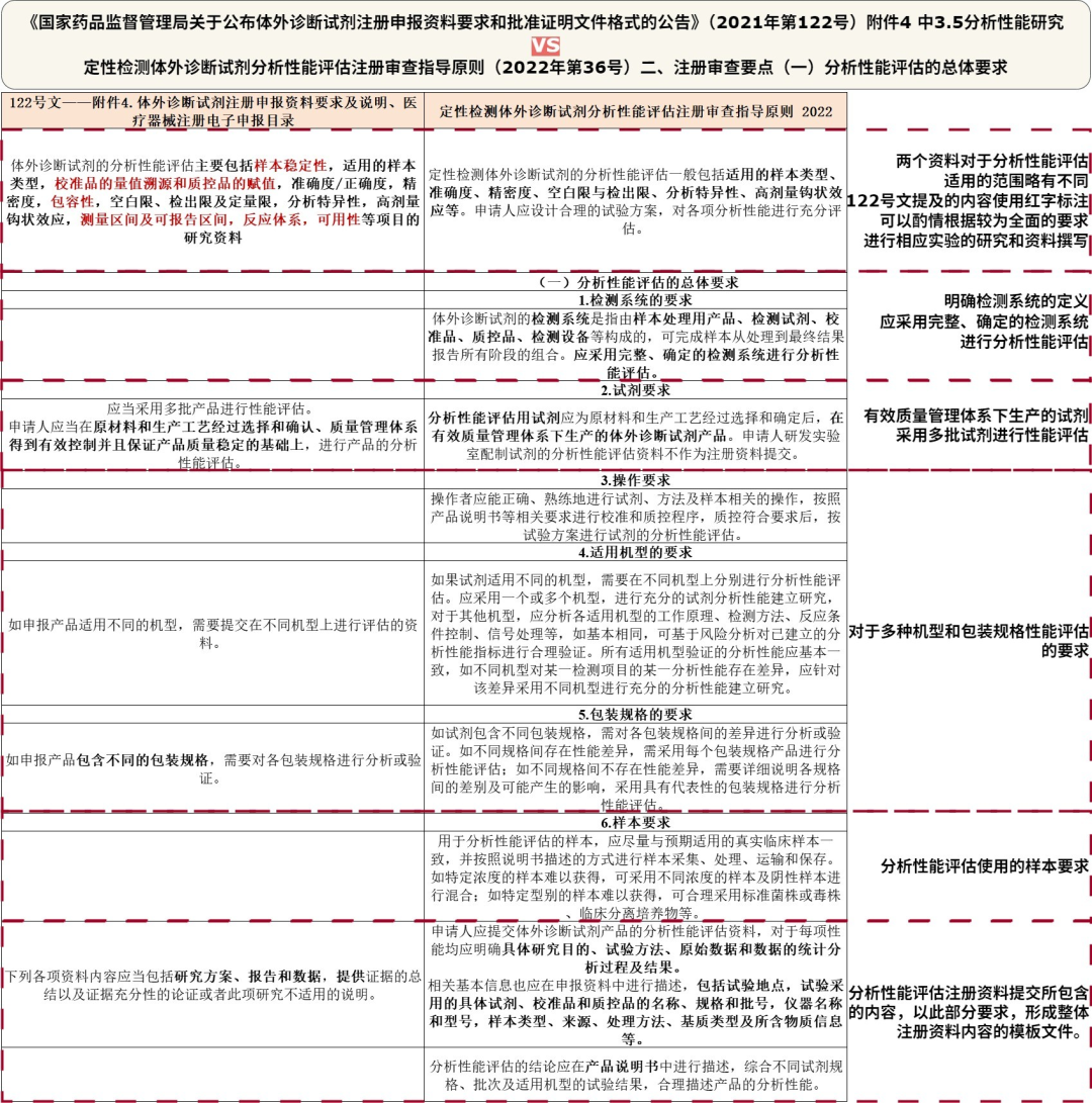 近期很有触动的一件事: 如何把话说清楚,越来越觉得 这是一个急需锻炼的能力。 其中有一种情况是:一个名词在不同的场景、不同的适用条件下,所代表的含义是不一样的。(在关于“设计开发”的理解上也是深有体会)。 今天想要和大家分享的内容是:注册资料中的分析性能研究。为什么要在分析性能的前面加一个注册资料的限定范围,是因为,在产品设计开发阶段就已经引入了“分析性能”的概念,把产品从研发转到生产,同样也有“分析性能”的概念,而我们今天所说的分析性能,不同于前两者,仅仅指的是在注册资料中的分析性能模块资料。 可能有的人会问,这几个阶段的分析性能有什么区别呢? 说一下我个人理解,我认为,是每个阶段对于分析性能的要求,或者说是目的,是不一样的。 是产品真正结合临床需求、市场情况、技术条件,综合进行评估,它更偏重于解决满足临床和市场需要以及发展技术上的优势等。应当根据产品预期用途和技术特征开展体外诊断试剂非临床研究。(引用“体外诊断试剂注册与备案管理办法 (2021-08-26)——第三章 体外诊断试剂注册——第一节 产品研制——第二十九条”) 研发人员把产品分析性能输出给生产质量之后,其实就变成了白纸黑字的“技术要求”,并且会在产品质量的控制过程中起着关键作用,在技术要求中的性能分析,考量又有所不同。 是在注册资料中体现出来的分析性能相关的要求,此部分的内容是基于设计开发阶段和转产阶段之后,综合而来的,是直接提交给审评老师进行产品注册申报的材料。以器械审评员的角度来看,了解这个产品的唯一途径,就是接收到的注册资料,而他们要做的事情,就是基于资料,保证获批产品的安全、有效。所以,对于产品的安全性和有效性的评估,是我们在这个阶段的分析性能研究中需要重点关注的地方。 今天我们称它为“注册资料中的分析性能研究资料”,既然是注册申报所用,所以必然根植于法规的要求。接下来,我也将从参考法规、资料入手角度、框架及整体要求、不同模块的侧重点四个方面进行分享。 01 参考法规 基于我们这次分享的分析性能还是围绕注册资料服务的,所以我们还是不能脱离了法规的指导,例行和大家屡一下涉及到注册资料性能评价要求的法规: ① 关于注册资料框架的法规: ② 个性化要求参考法规: 定性检测体外诊断试剂分析性能评估注册审查指导原则(2022年第36号) 定量检测体外诊断试剂分析性能评估注册审查指导原则(2022年第32号) 以及器审发布的针对产品的指导原则和相关行标。 02 资料撰写入手角度 ① 在确认注册资料提交范围时,可以依据注册资料申报要求法规进行整体资料目录的和内容框架的搭建; ② 在确认每份注册资料内容时,需要依据个性化的指导原则、国行标,进行实验的设计,并输出实验报告和数据,填充进我们之前的框架中,形成最终的注册资料。 03 框架以及文件内容整体要求 此环节的主要目的,是确认“注册电子申报目录”中“3.5分析性能研究”模块,针对申报产品的特性,需要提交哪些资料,以及每个资料必须提供的内容,形成针对不同子模块的模板文件。 此环节主要的依据法规为“122号文”和“医疗器械注册电子申报目录文件夹结构”,我将这两个法规对于“分析性能研究”模块的内容进行了对比,基本上内容一致,参考两个法规发布时间点,“电子申报目录”应该是以“122号文”为基础进行的细化。(如下图所示) 简单说明一下图示内容,以及图中隐藏内容的情况。图中最左侧一列,为两个法规(“122号文”和“注册电子申报目录”)对于分析性能研究的整体要求,右侧三列,为针对3.5章节中,包含的子模块内容以及其研究内容的相关要求。此次分享,按照电子申报目录内容,隐藏了CH3.5.8 测量区间及可报告区间、3.5.9 阳性判断值或参考区间、CH3.5.10反应体系以及3.6.5 试剂稳定性四个模块,因为阳性判断值研究、反应体系研究、主要原材料研究、试剂稳定性研究的考量逻辑以及内容,和其他的性能分析略有不同,并且会更倾向于在早期设计开发阶段进行研究,同时有的模块会有针对性的法规进行参考,后续会在设计开发-性能分析中再进行详细分享。 另外,针对性能评估的共性要求,在《定性检测体外诊断试剂分析性能评估注册审查指导原则》中有所提及,结合“122号文”性能评估通用要求,一起参考,形成资料的模板内容。(如下图所示) 根据以上共性的资料要求,我们可以归纳出每个模块资料的框架: 把整体的资料框架搭建起来之后,我们需要根据产品设计开发-分析性能评估的情况,进行后续内容的填充和丰富。 关于设计开发-分析性能评估和注册资料-分析性能评估,两者如文章开头提到,目的是不一样的,所以关注点和侧重点也会不一样。因此,在本文中,下一部分关于每个模块的分析性能分析,更侧重的是依据相关法规和指导原则,成系统的分析性能评估。实际需要结合产品的预期用途和技术特点进行特殊考量思路,后续会在设计开发-分析性能评估中再做详细学习。 04 不同模块分析性能实验的侧重点 依据“注册电子申报目录”和上述归纳的模块资料框架(下图第一列),列出在撰写注册资料时,需要考量的重点和体现的信息(下图第二列),同时列出和产品说明书的对应关系(下图第三列),如下图所示。 以上内容,从法规参考、到资料撰写