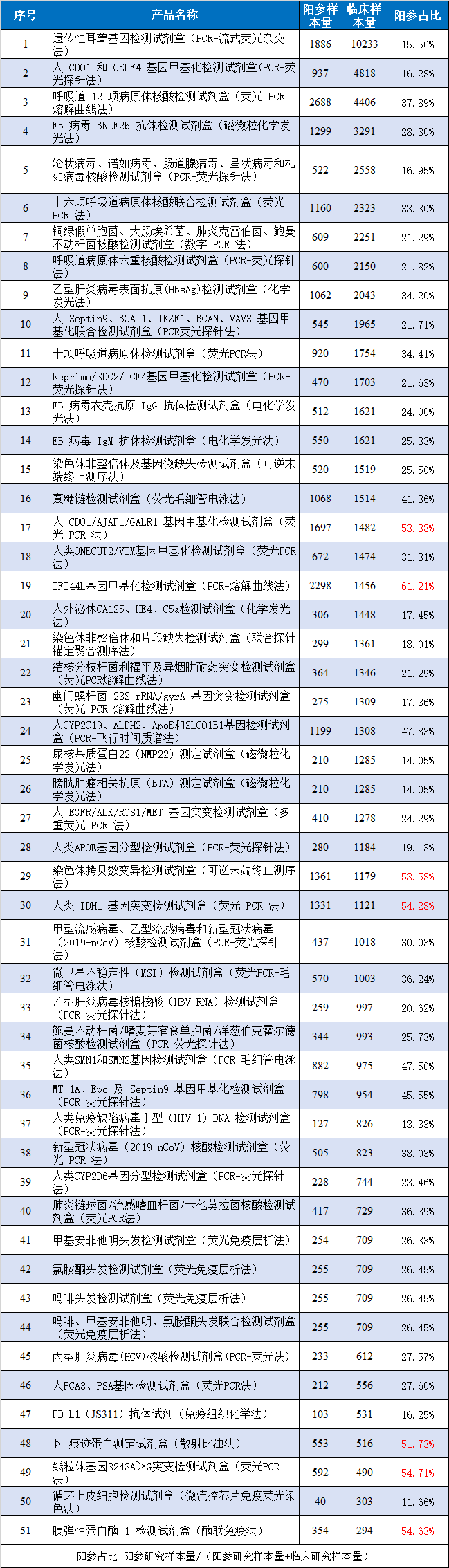 本次统计的51款产品中,阳参研究样本量/(阳参研究样本量+临床研究样本量)的分布为11.6%-61.2%,平均值为30.0%。(详细数据见文章后续表格)