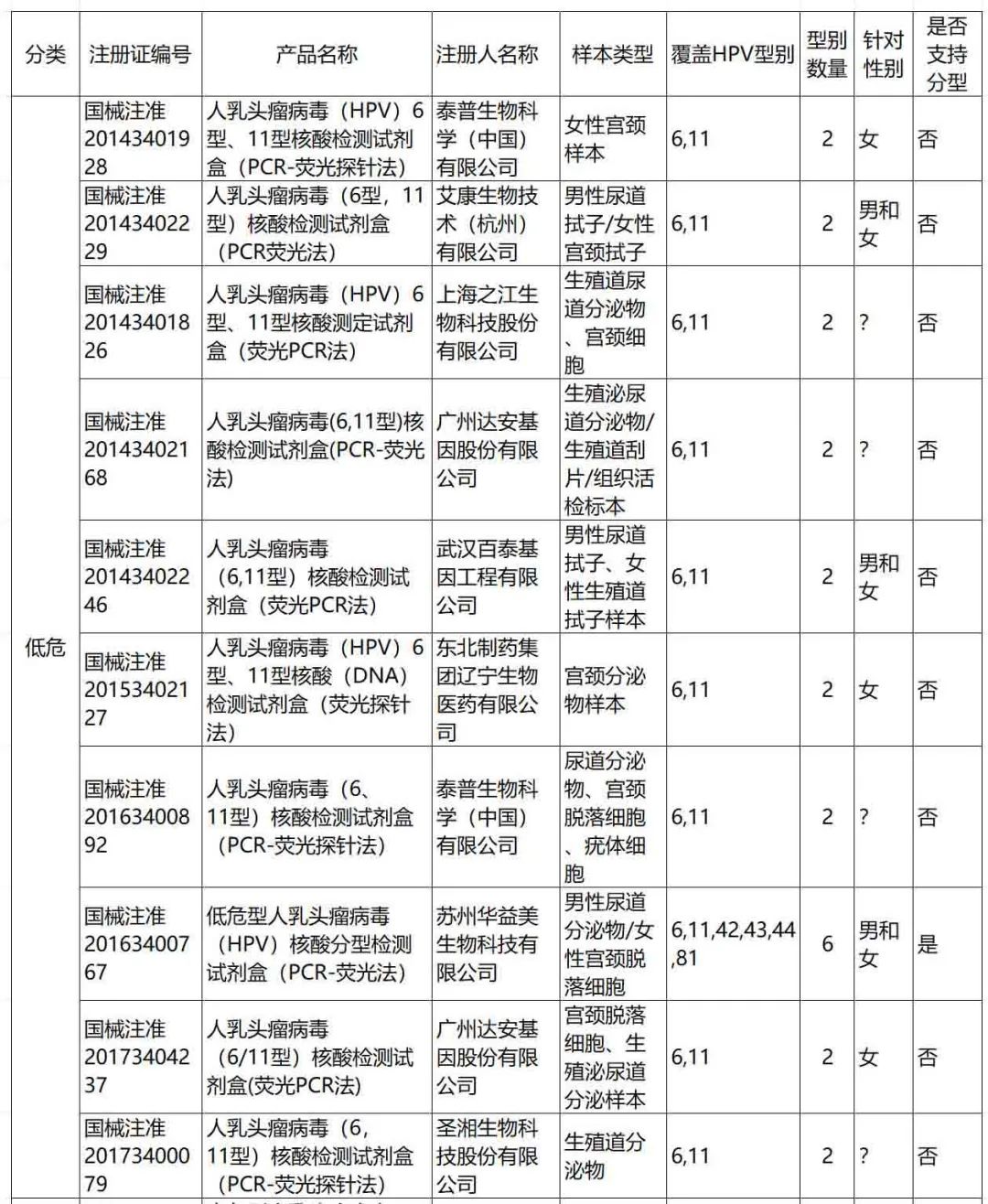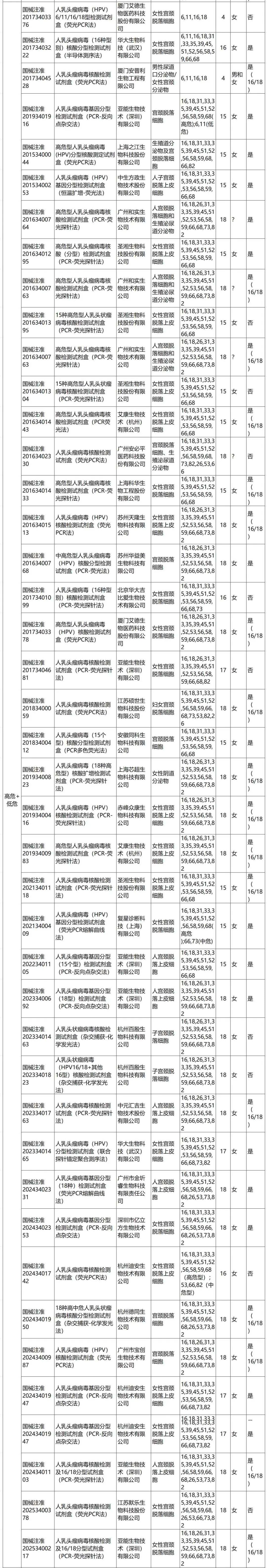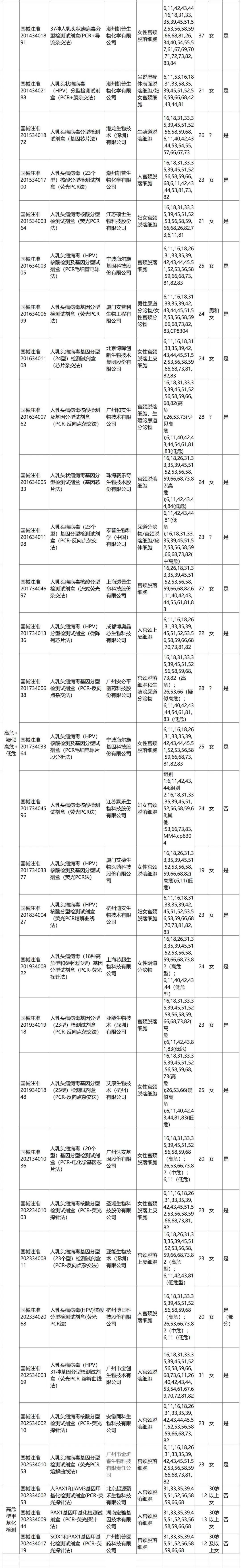 整体看,当前获批产品中检测样本类型包括宫颈样本(分泌物、脱落细胞)、生殖泌尿道相关样本(阴道分泌物、男女生殖道拭子、尖锐湿疣体表面脱落细胞等)。(附录一)