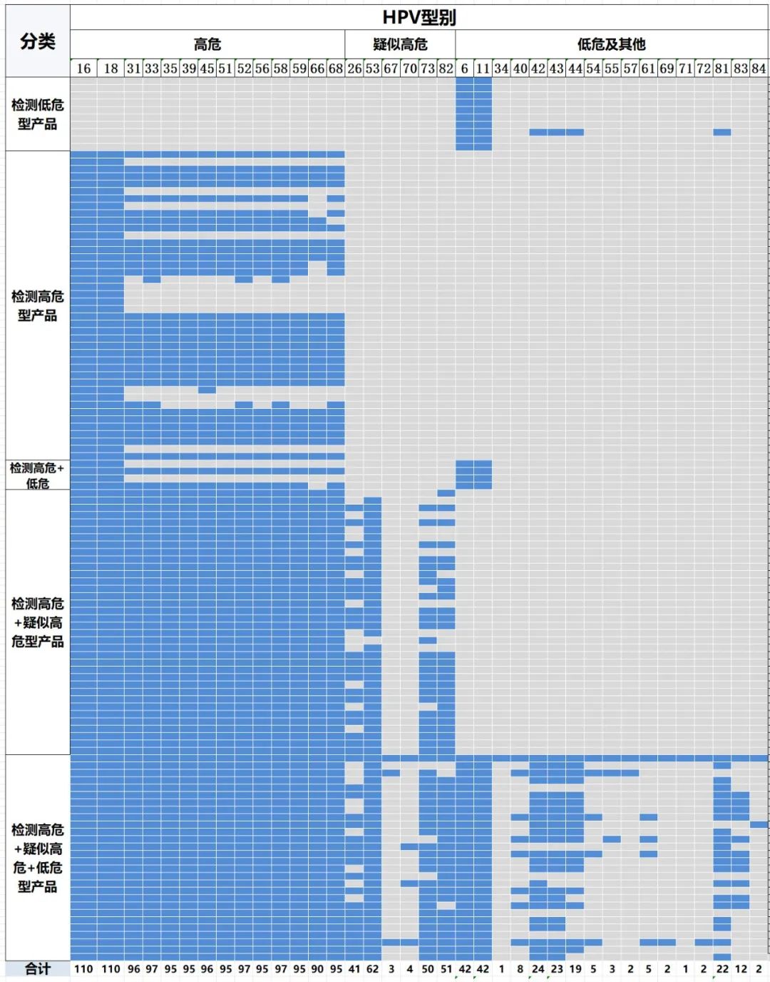 图2 获批试剂盒HPV型别覆盖情况 。注:每行代表一个产品,蓝色表示该产品覆盖了此型别HPV。参考2012年国际癌症研究机构HPV分类,结合国内标准做校正,初步参考分类如下:高危:16、18、31、33、35、39、45、51、52、56、58、59、66、68;疑似高危:26、53、67、70、73、82;低危:6、11、40、42、43、44、54、61、72、81、89