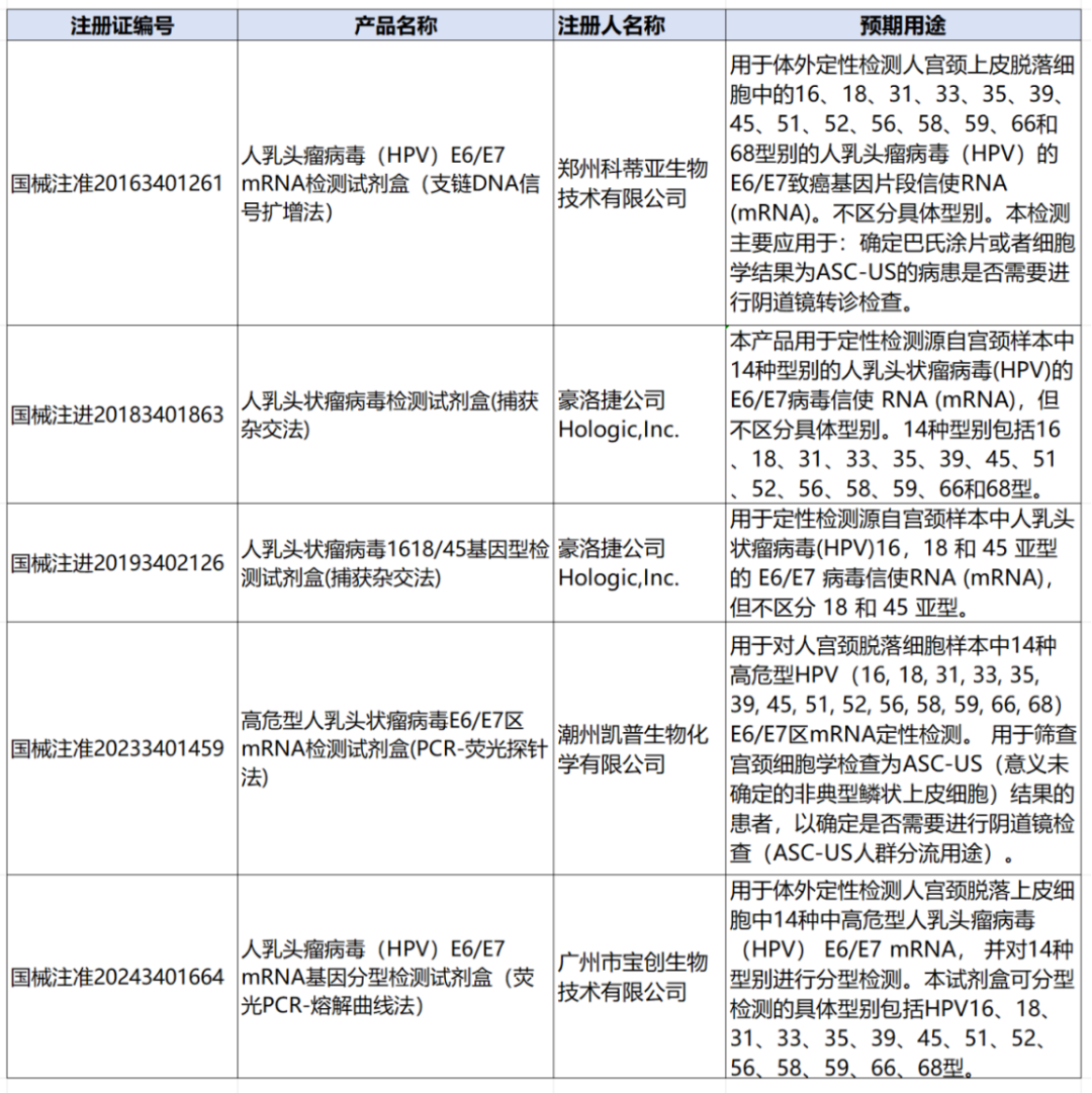 此外,有5款产品选择以HPV的E6/E7致癌基因片段信使RNA (mRNA)为检测目标(附表一)