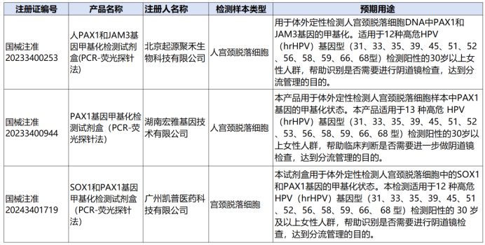 有3款高危型HPV甲基化检测试剂盒。根据中国子宫颈癌筛查指南(二),PAX1、ZNF582、SOX1、JAM3、ASTN1、DLX1、ITGA4、RXFP3、SOX17、ZNF671 单独或联合甲基化检测在 HPV 阳性人群中检出宫颈上皮内瘤变3级(CIN3)或更严重的病变(CIN3+)具有较好的特异度,可降低阴道镜转诊率,避免了过度治疗和造成患者不必要的焦虑。