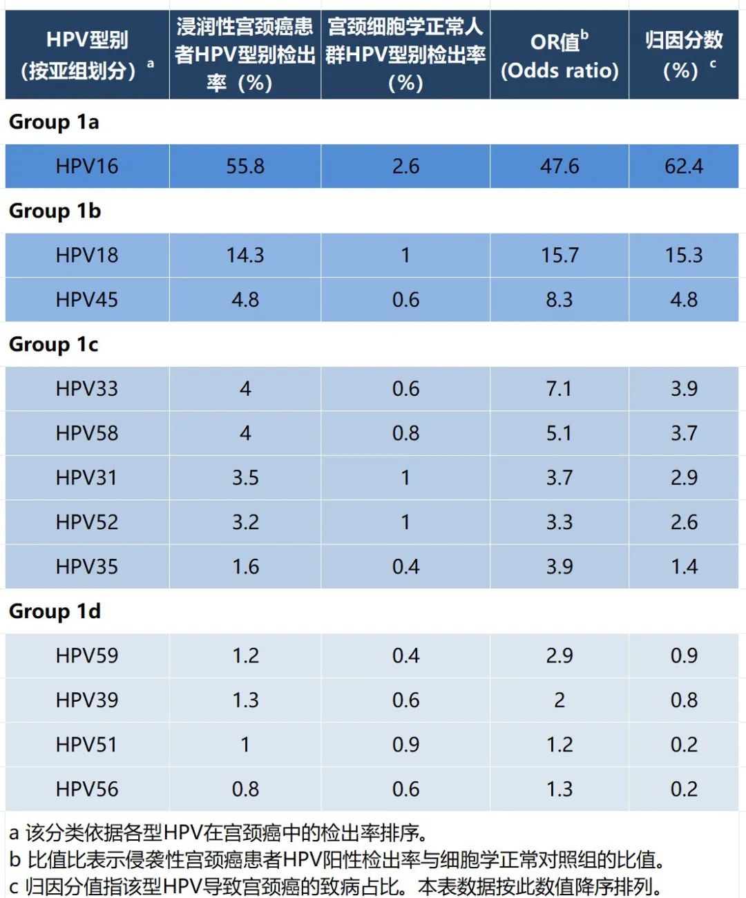 高危型人乳头瘤病毒(HR-HPV)持续感染是引起子宫颈癌的主要病因。低危型HPV一般与尖锐湿疣或低度鳞状上皮内病变相关。WHO根据不同型别高危型HPV的致癌性将其分成4大类,其相应的致病率见表1。
