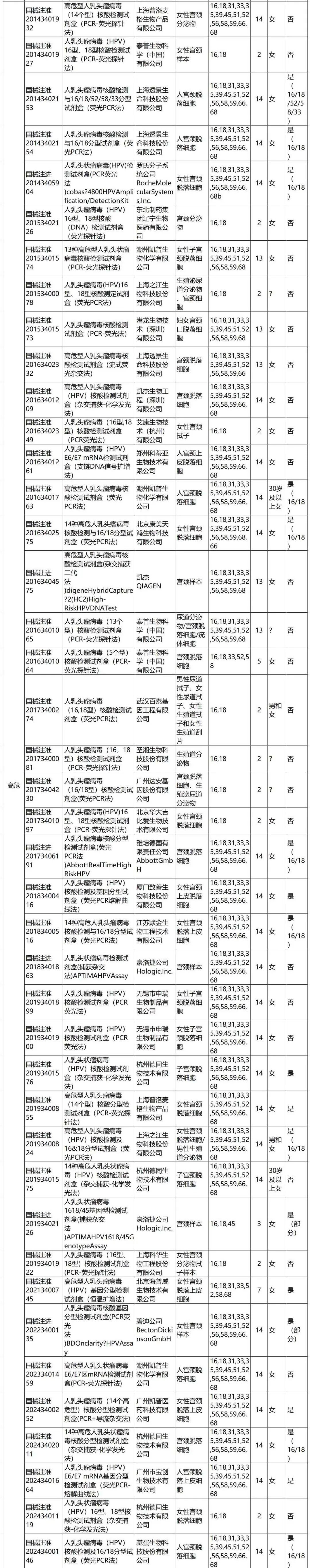 国内高危型HPV的型别要求与WHO略有差异,根据人乳头瘤病毒(HPV)核酸检测及基因分型试剂注册审查指导原则(2024年修订稿)(征求意见稿),高危型HPV检测可覆盖的HPV基因型别应至少包含16、18、31、33、35、39、45、51、52、56、58、59、66、68型(共14种,与WHO相比增加了66和68型),产品亦可同时包含26、53、73、82型中的一个或数个型别。根据现有的研究成果,若可检测的HPV基因型别不能涵盖上述14种高危型,则可能造成阴性预期值无法达到临床要求,因此不建议单独用于上述预期用途。