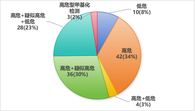 图1 按照产品预期用途分类,国内获批HPV检测产品的构成情况。注:参考2012年国际癌症研究机构HPV分类,结合国内标准做校正,初步参考分类如下:高危:16、18、31、33、35、39、45、51、52、56、58、59、66、68;疑似高危:26、53、67、70、73、82;低危:6、11、40、42、43、44、54、61、72、81、89