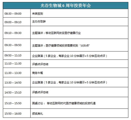 谁是下一个万亿市场?最近又有了新答案——大健康产业。 大健康?从以前的“有病看病没病保健”,到现在的“健康生活解决方案”,当传统的药企们纷纷进军保健饮料、药妆等领域,当从创新中国Demo China走出的“春雨医生”们借助互联网的力量颠覆传统的医疗健康模式……我们知道,大健康正在传递正能量! 12月31日,创新中国来到武汉光谷生物城,奉上一场说走就走的路演——同时也是光谷生物城6周年投资年会。它是一位在大健康领域颇具实力的小伙伴:聚焦生物医药、生物农业、医疗器械、生物制造、健康服务和生物能源等领域的生物产业新城,将用它汇聚的优质资源为路演的创业者们提供丰富的奖励。 这一次,我们将一起见证“大健康”的巨大力量! 在“光谷生物城6周年投资年会暨2015创新中国走进武汉”上,你将现场目击: “医疗健康改造”模式大起底,细数移动医疗那些事儿和投资“尖叫点” 创始人现身说法,分享大健康新玩法 相关领域最专业的投资人炉边谈话,从机遇说起,告诉你如何打动TA 10个最火项目现场路演,10+5分钟超长show time,详解创业攻略、犀利点评 创业者VS投资人,逆袭战 光谷生物城6周年投资年会 暨2015创新中国走进武汉 主办方:光谷生物城 联合主办方:创业邦 活动时间:2014年12月31日 (周三)08:30—16:00 活动地点:武汉纽宾凯光谷国际酒店(东湖新技术开发区高新大道光谷六路十八号(光谷生物城)) 活动议程(拟):