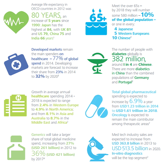 到 2012 年止,世界经济合作与发展组织国家(Organization for Economic Co-operation and Development,OECD)人均寿命预期为 80 岁,相比 1990 年呈现大幅老龄化现象。 其中日本最为严重,平均寿命预期为 84 岁,英国为 81 岁,美国 79 岁,中国 75 岁,而印度为 66 岁。 预计到 2018 年,超过 65 岁人群数量会达到 5.8 亿,占全球人口 10%,也就是说,其中每10个日本人中就有一位超过 65 岁的老年人。到2020年,我国正式进入老龄化严重阶段!