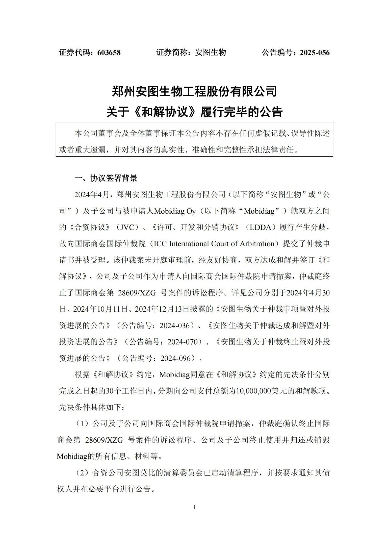 7月28日,安图生物(603658)发布公告,关于《和解协议》履行完毕的情况。公司及其子公司与Mobidiag就《合资协议》和《许可、开发和分销协议》的履行产生分歧,向国际商会国际仲裁院申请仲裁。