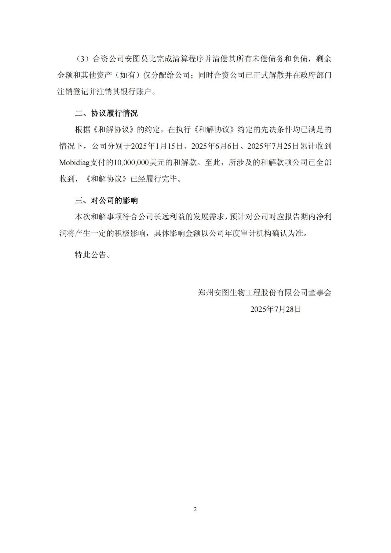 根据协议约定,Mobidiag同意在《和解协议》约定的先决条件分别完成之日起的30个工作日内,分期向安图支付总额为10,000,000美元(约7000万元人民币)的和解款项。双方应当采取必要措施以解散和清算合资公司安图莫比。(安图生物与Mobidiag Oy签署投资,2018年)